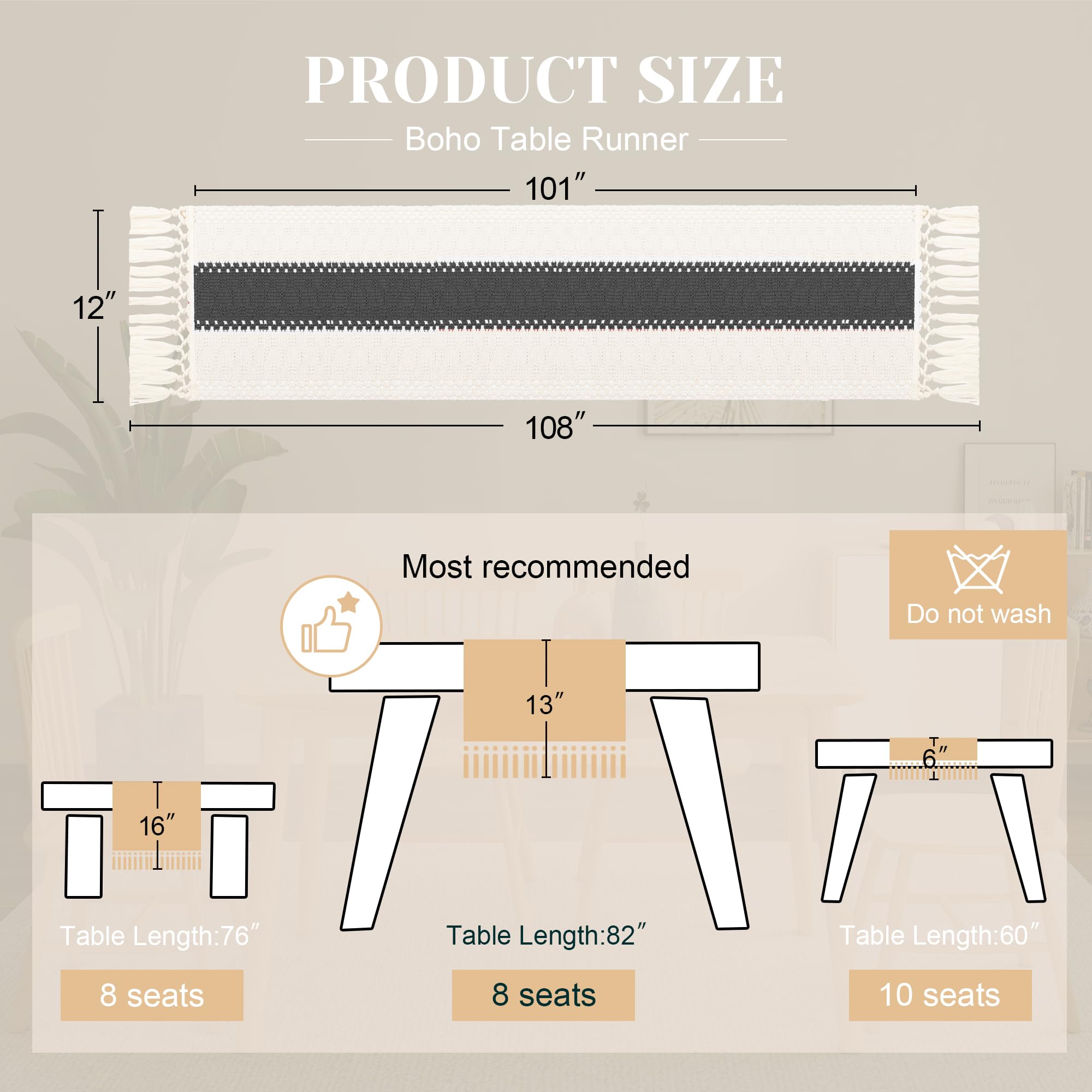 [Perfect 108 Inches Long] Our macrame table runner with tassels measures 12 x 108 inch, fits a dining table that seats 4-8 people. It can give your tables a rustic and boho look. (Because it is folded in the bag, when you take it out, the table runner will have creases, which will affect your measurement. So, please make sure the table runner is placed neatly and flat before measuring)