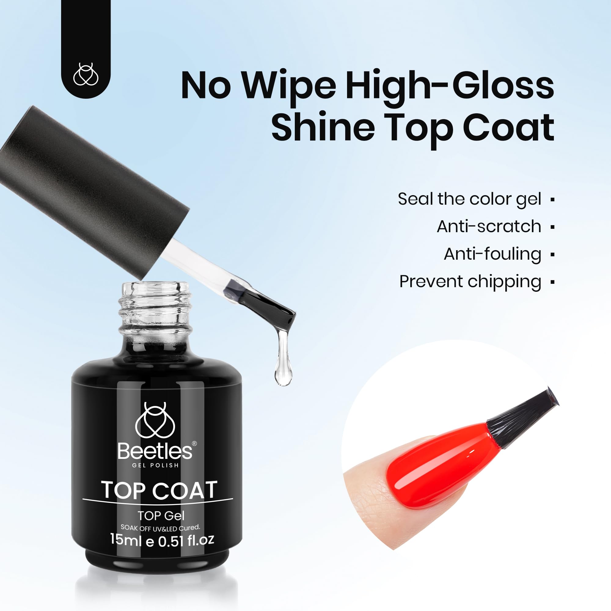 2pcs Large Capacity Gel Top Coat: Includes two 15ml bottles of Beetles No Wipe Top Coat. With a flexible formula that resists nicks, chips, and smudges, this glossy top coat delivers a flawless, salon-quality finish that lasts over 28 days.