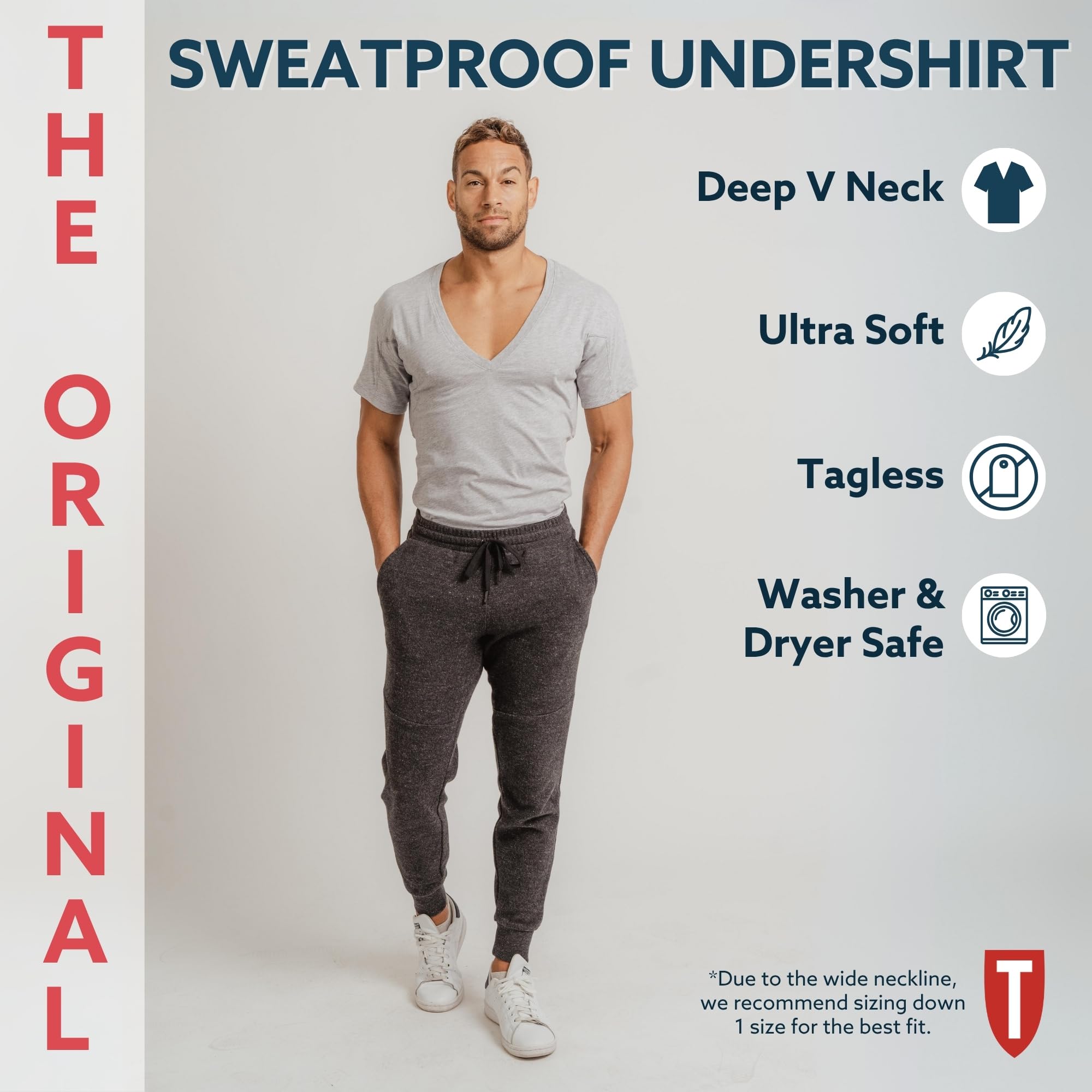 Versatile Sweat & Odor Defense T-Shirt: Our stylish men's deep v neck undershirt complements any outfit while discreetly keeping sweat and body odor at bay, giving you the confidence to wear any dress shirt without fear of sweat marks; these original fit undershirts are made from 100% premium combed cotton (Heather Grey 90/10 cotton/poly) exclusive of the underarm pads inner layer; tagless with a lay-flat collar for a seamless fit