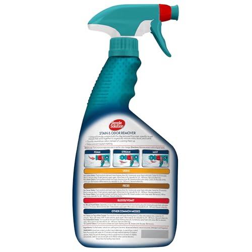 Eliminate tough pet messes with Simple Solution Stain and Odor Eliminator Spray for Dogs & Cats, a powerful enzymatic spray designed to permanently remove stains and odors caused by urine, feces, vomit, and more. This 32 oz floor cleaner features 2X Pro-Bacteria Cleaning Power, breaking down even the most stubborn messes at the source. Perfect for pet parents, it works as a dog odor & stain remover, pee remover carpet cleaner, cat pee odor remover carpet, and dog smell remover, ensuring your home stays fresh and clean. Safe for use on carpets, upholstery, bedding, fabric toys, clothing, mattresses, and any water-safe surface, this pet enzyme cleaner cat solution is also an excellent carpet pet stain remover, enzyme cleaner upholstery, and car carpet odor remover. The patented 3-in-1 nozzle sprayer lets you choose between foam, mist, or stream for targeted cleaning. Whether you need a cat pee enzyme cleaner mattress, pet stain eliminator, or dog enzymatic cleaner, this enzyme spray odor eliminator is your go-to choice. Ideal for tackling puppy accidents, pet stain removal, and cat pee smell remover, it’s the best dog pee cleaner for keeping your home fresh. Trust Simple Solution—your expert in pet stain neutralizer, dog floor cleaner, and anti-pee spray for dogs inside!