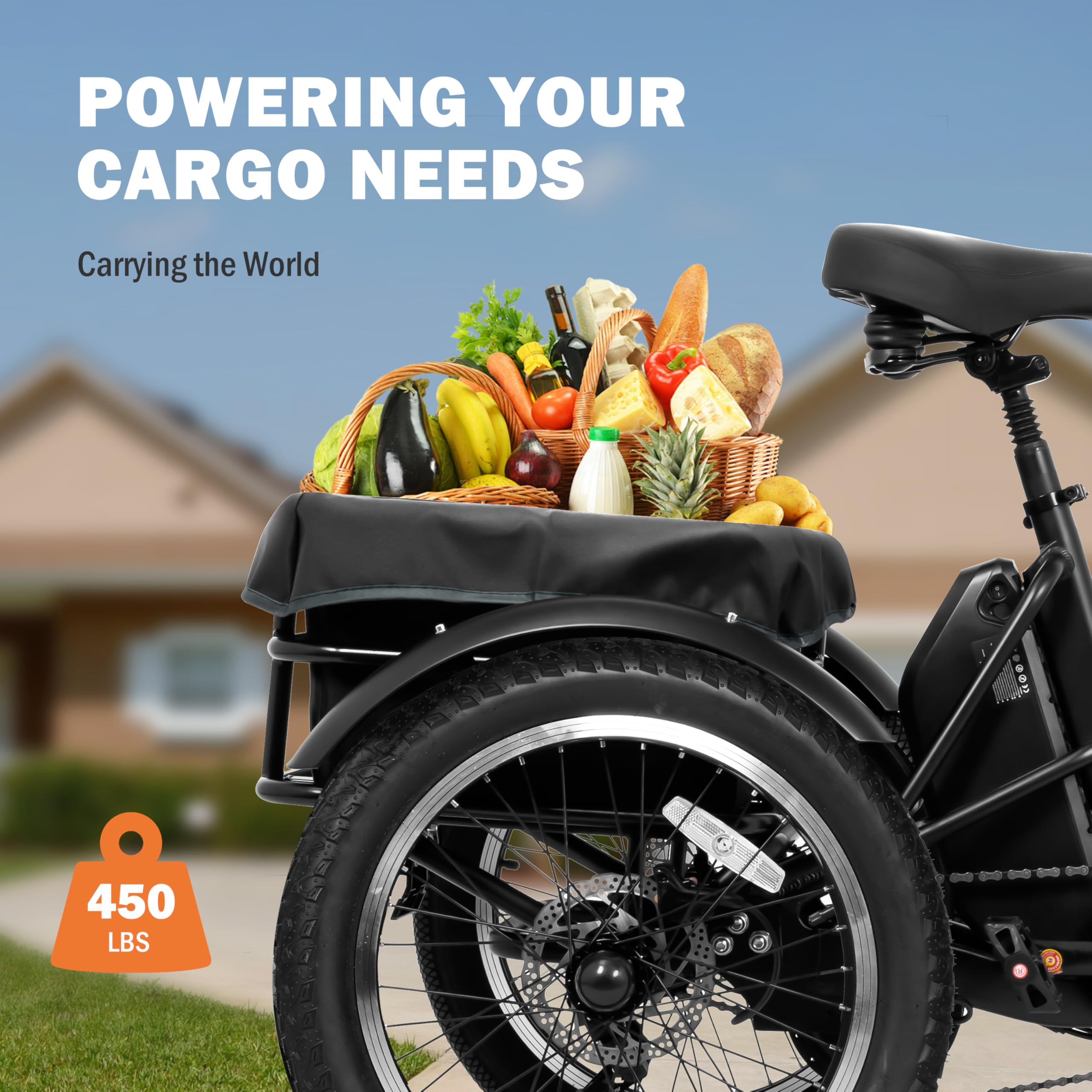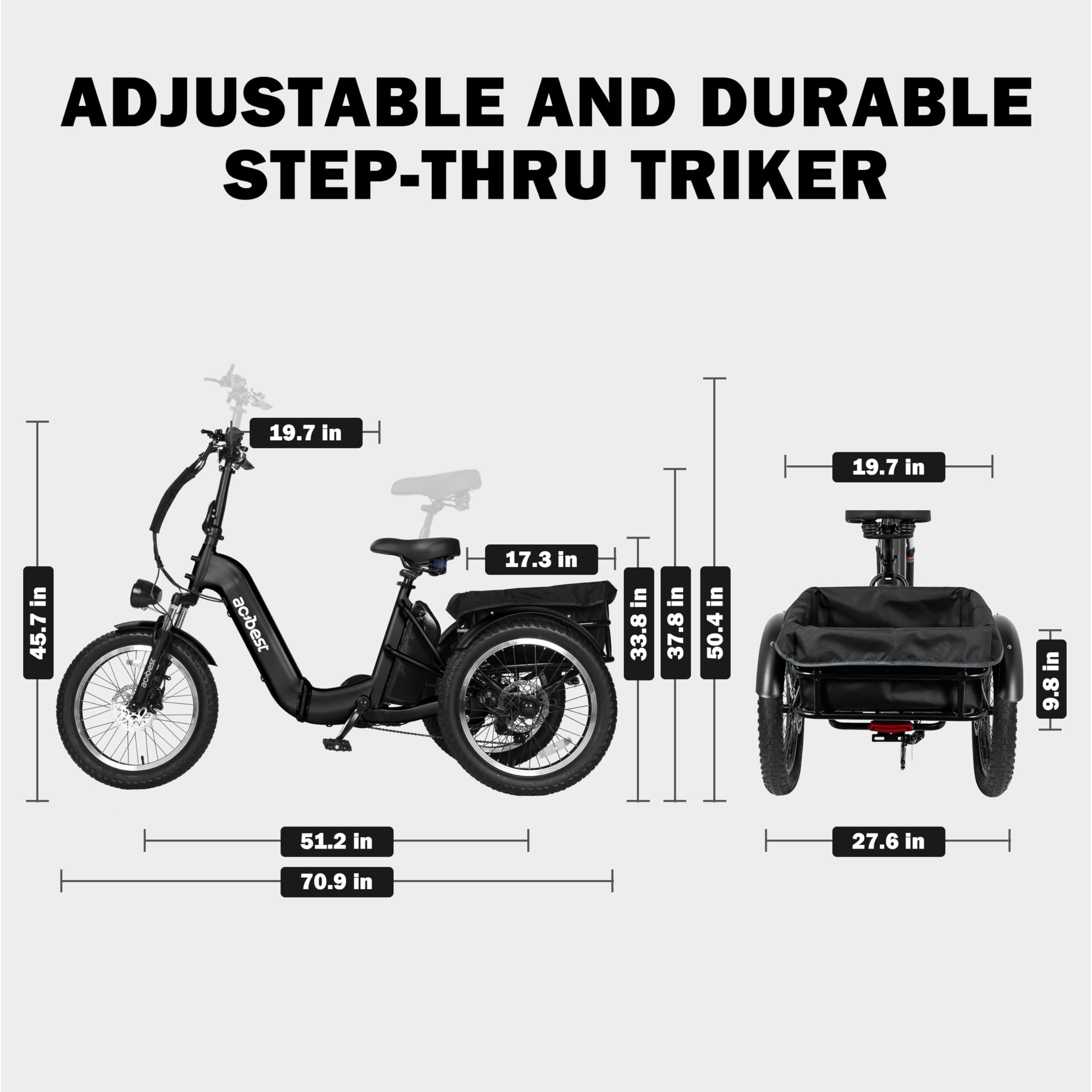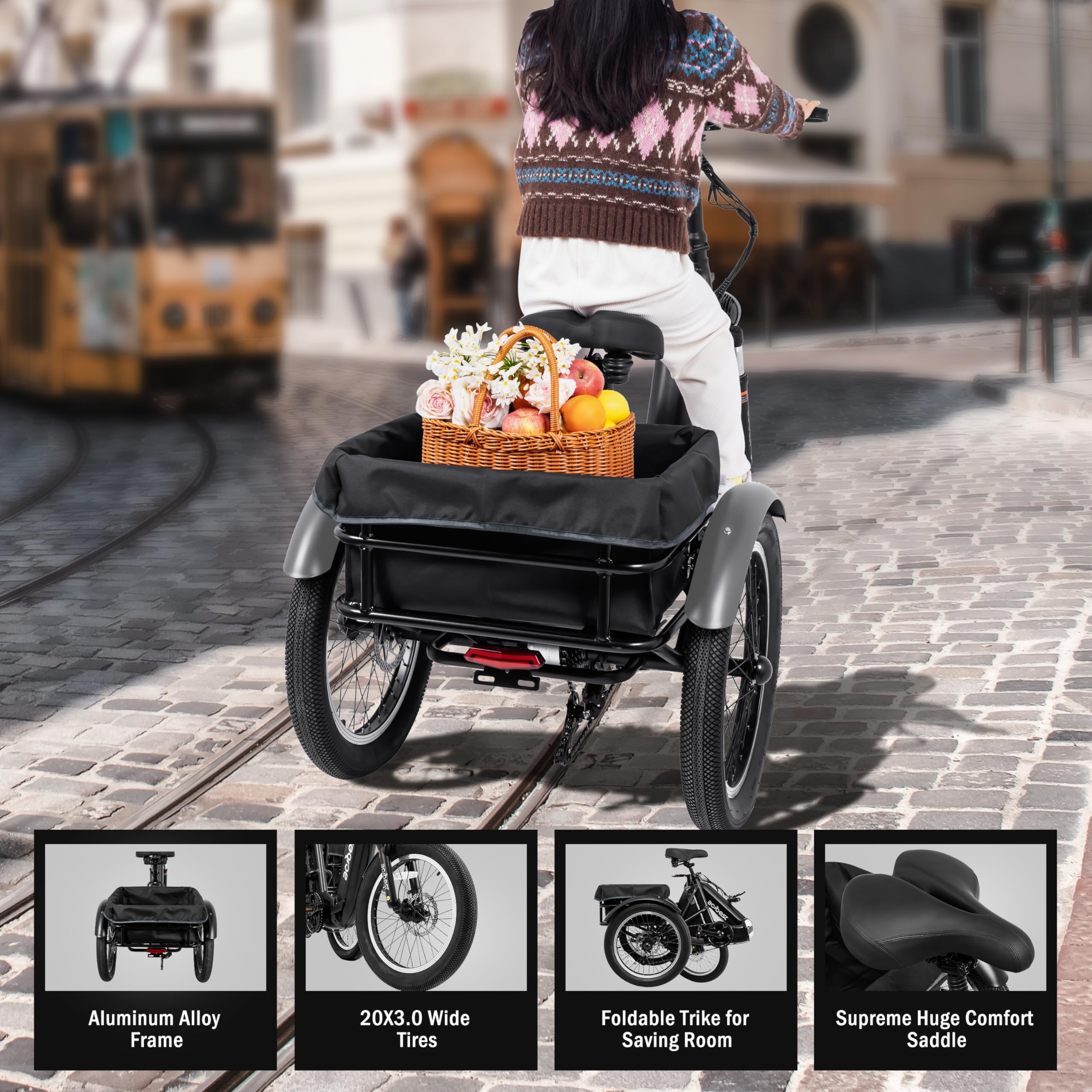 Powerful and Quiet Operation: Equipped with a 1000W peak high-speed brushless motor and a sine wave controller, this tricycle ensures efficient performance with low noise levels for a serene riding experience, reaching speeds of up to 16 MPH.