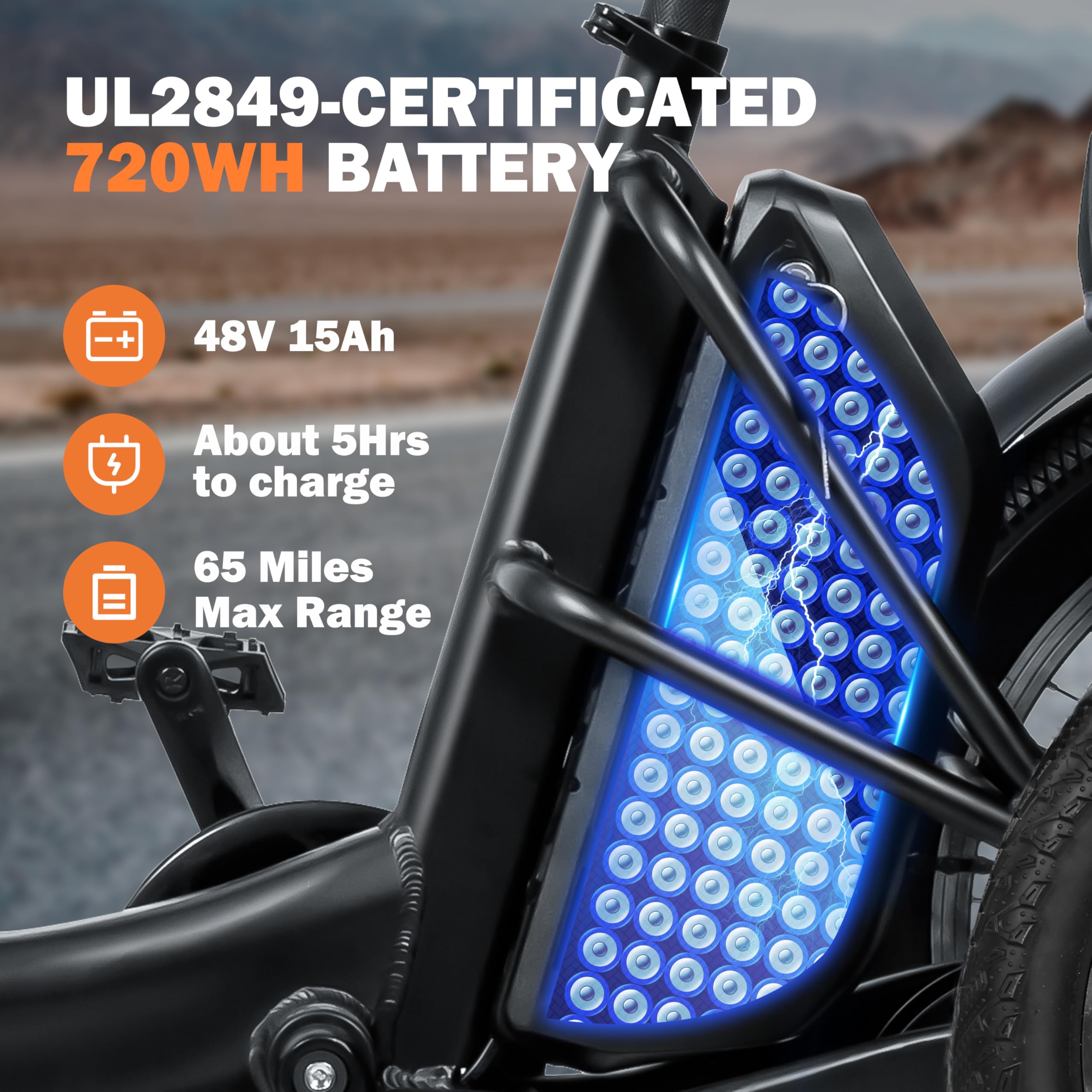 Long-lasting and Portable Battery: The removable 748.8Wh (48V 15.6Ah) battery provides extended ride times with a maximum range of 65 miles and convenient charging on the go, allowing for worry-free adventures.