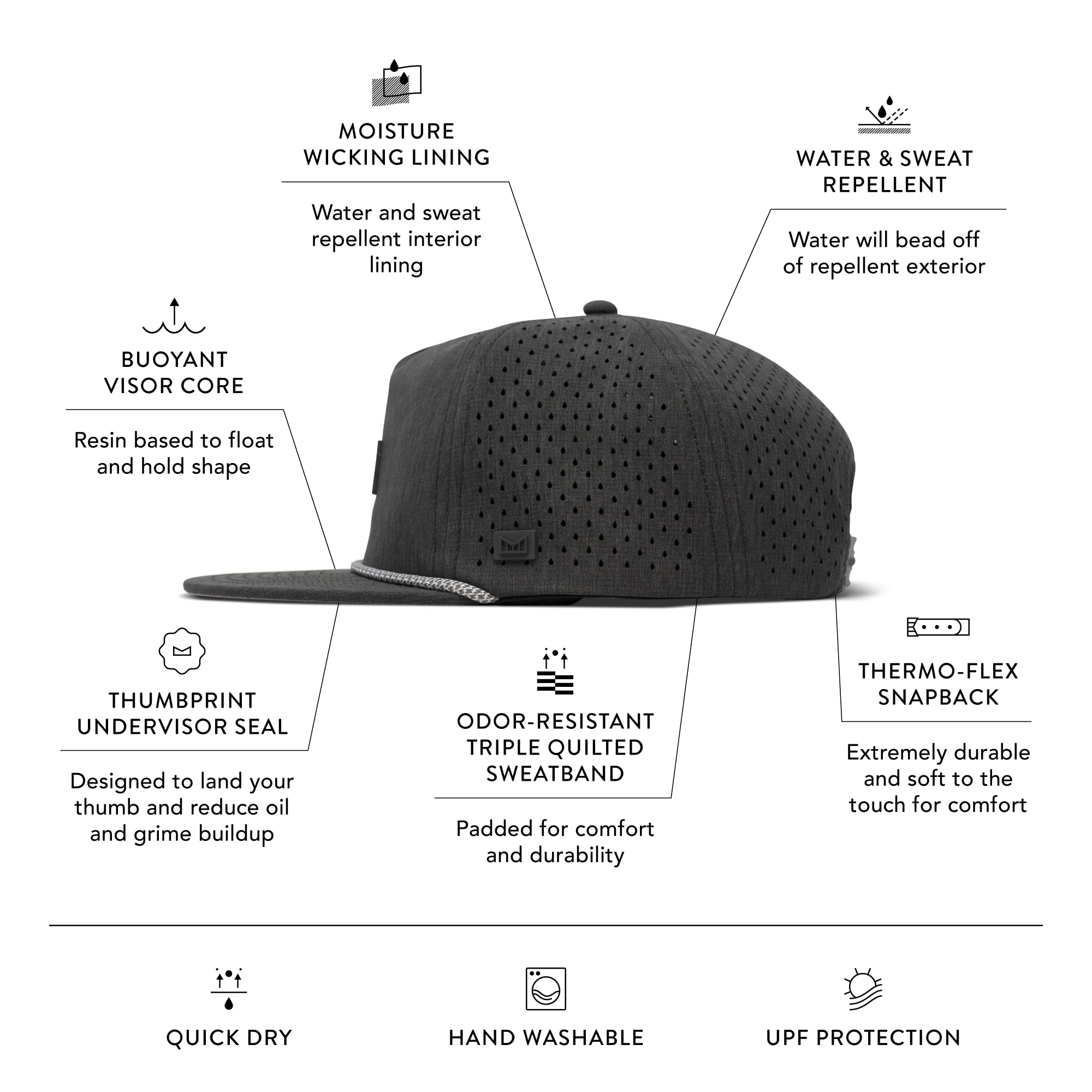 PERFORMANCE SNAPBACK HAT: Exterior crown has hydrophobic crown panels, laser-perforated side & rear panels for breathability, and custom soft touch snapback closure. Honeycomb Visor is designed for weight reduction and packability