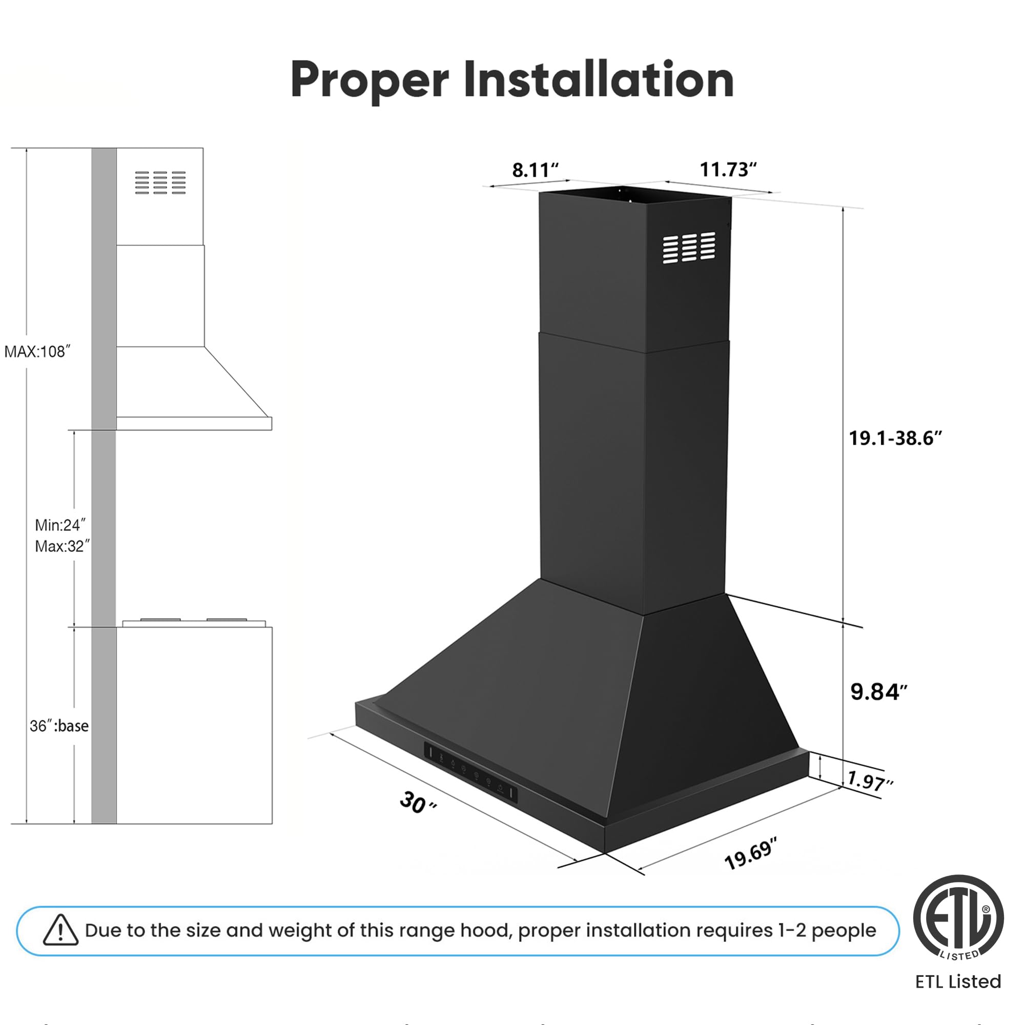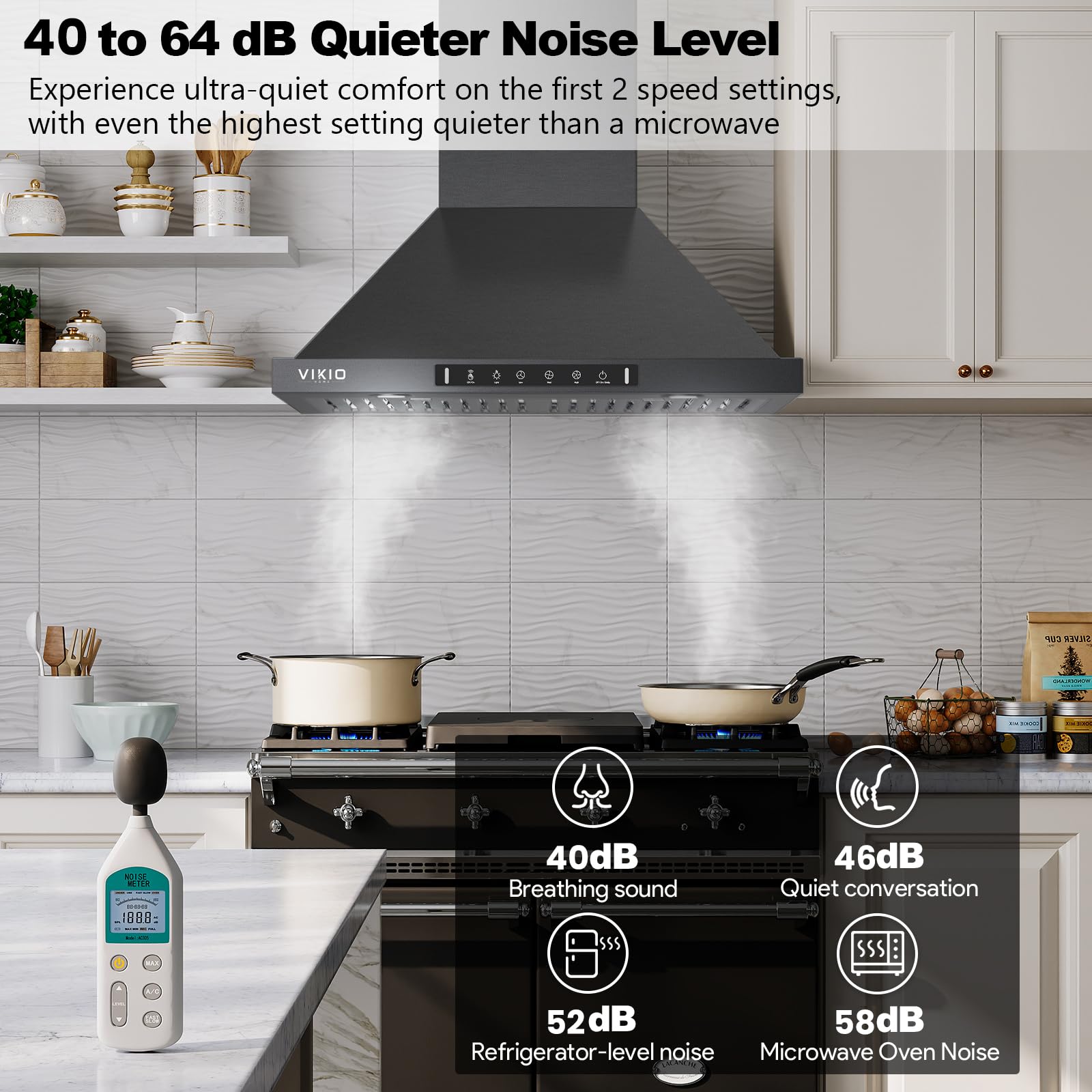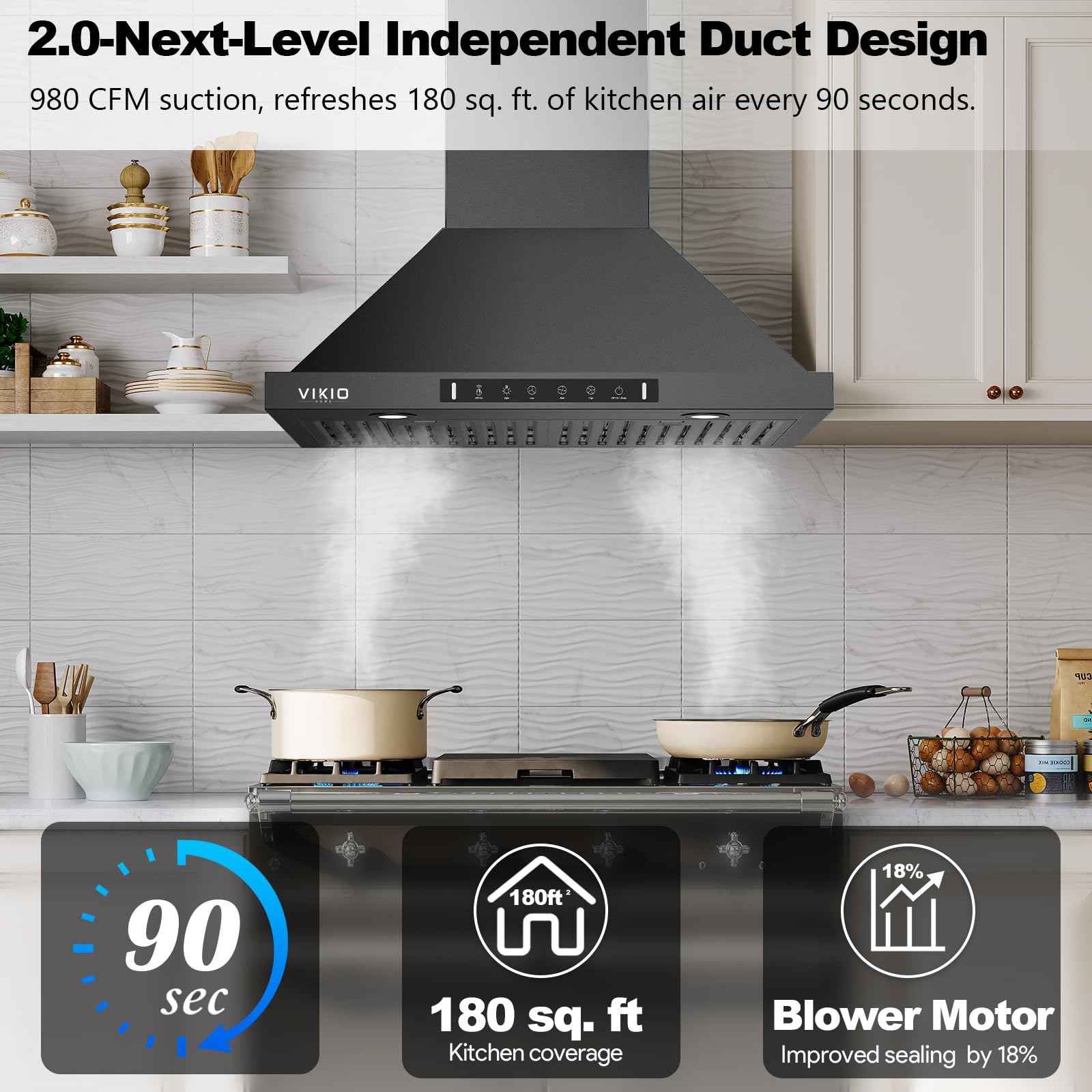 Why choose Vikio Home 2.0 range hood? This 30-inch wall-mounted range hood uses an upgraded motor that is 18% tighter and 10% more powerful. In addition, the matte black body is easier to clean. The 30-inch kitchen range hood can adapt to most kitchen spaces and is more convenient to install and use.