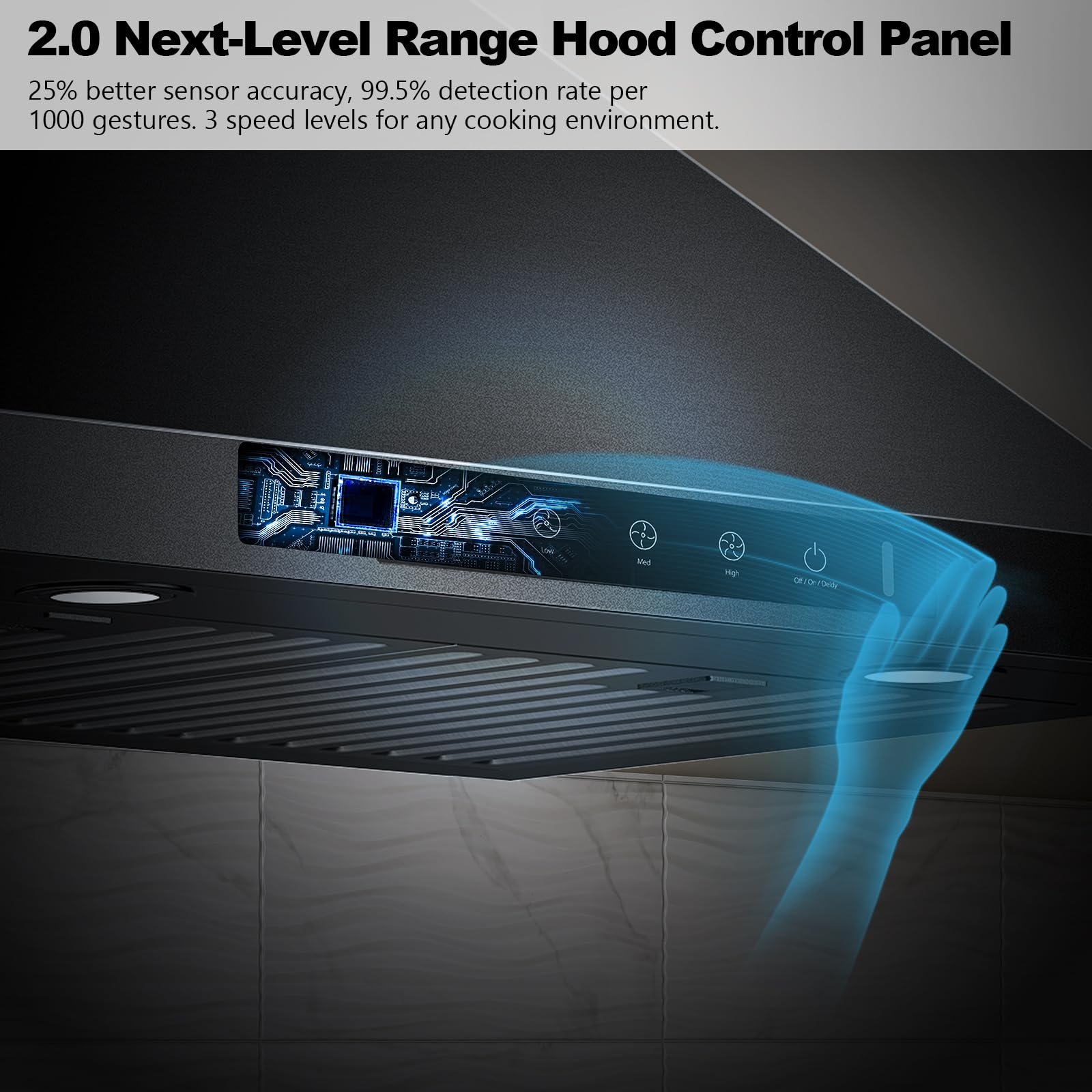 New upgraded gesture control panel: 25% more accurate range hood sensor detection and a 99.5% success rate for every 1,000 gestures. This newly upgraded panel supports the memory function to default to the last used settings for easier use, which can minimize accidental triggering and malfunctions, and provides touch and gesture control options (can be disabled).