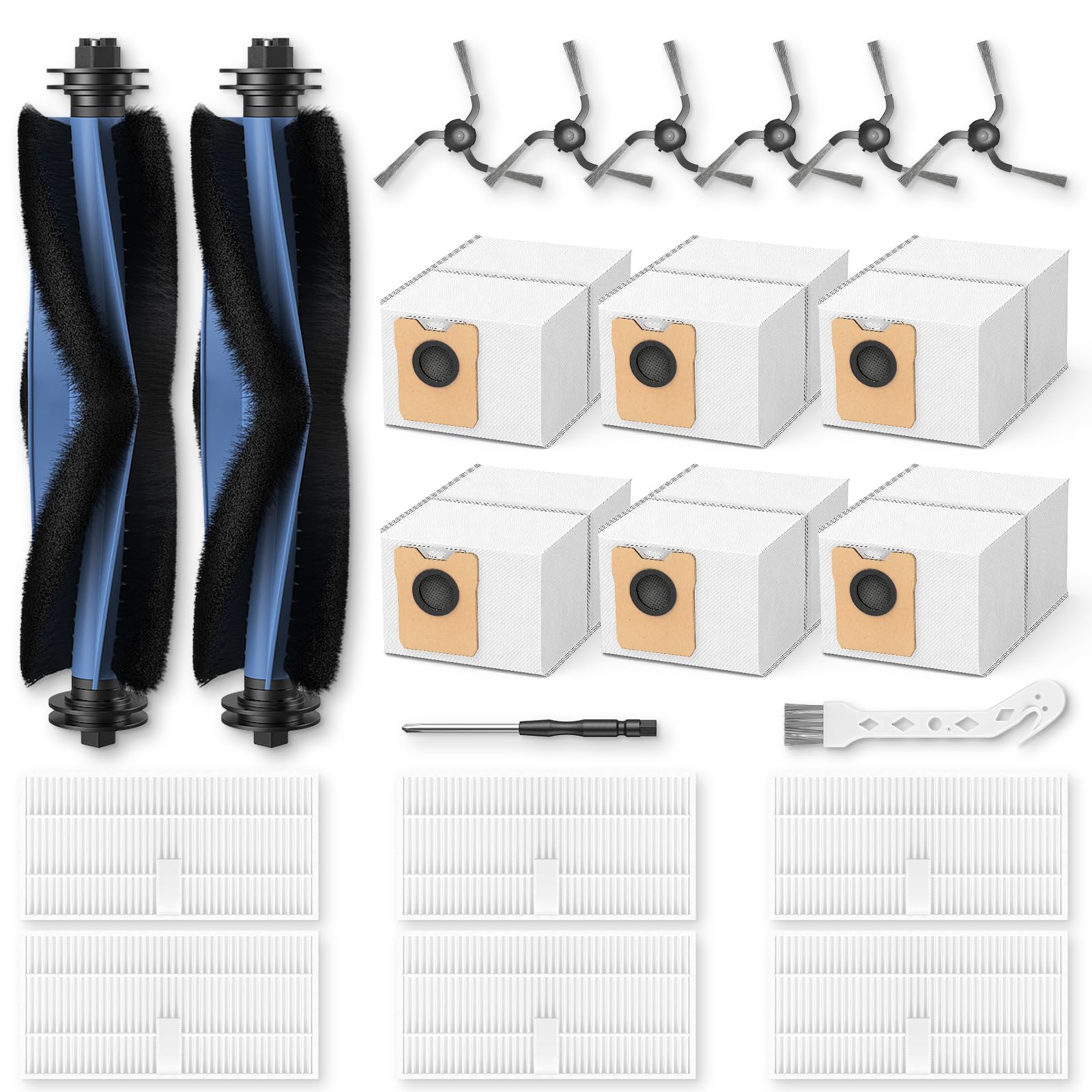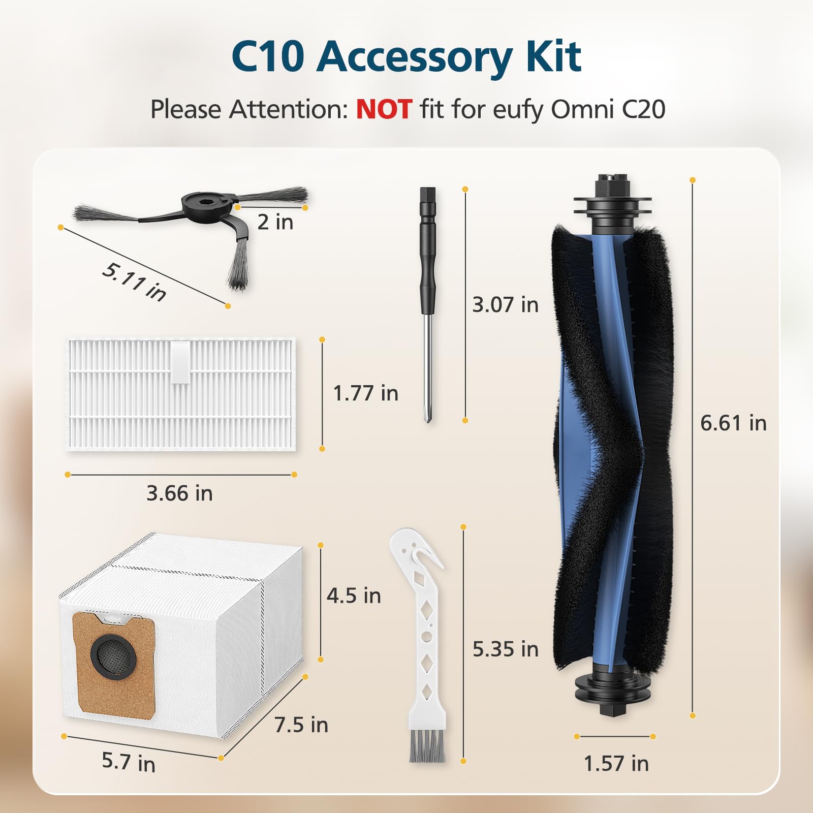 𝗣𝗮𝗰𝗸𝗮𝗴𝗲 𝗜𝗻𝗰𝗹𝘂𝗱𝗲: 2* Main Rolling Brush, 6* Washable Filter, 6* Side Brush, 6* Dust Bag, 2* Cleaning Tool. The C10 replacement parts work the same as the original to keep your C10 robot vacuum running at maximum efficiency at all times