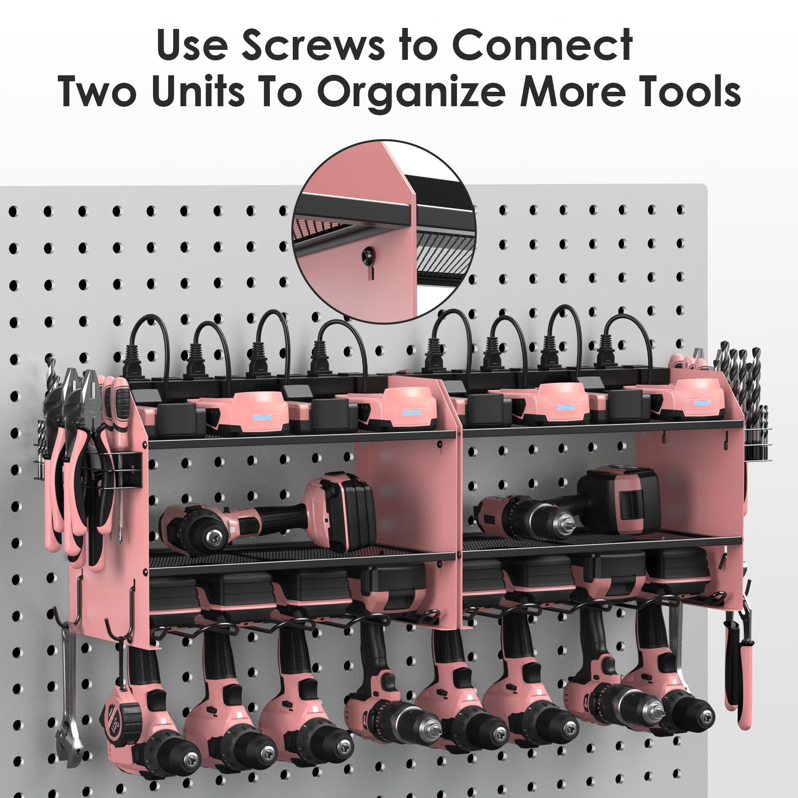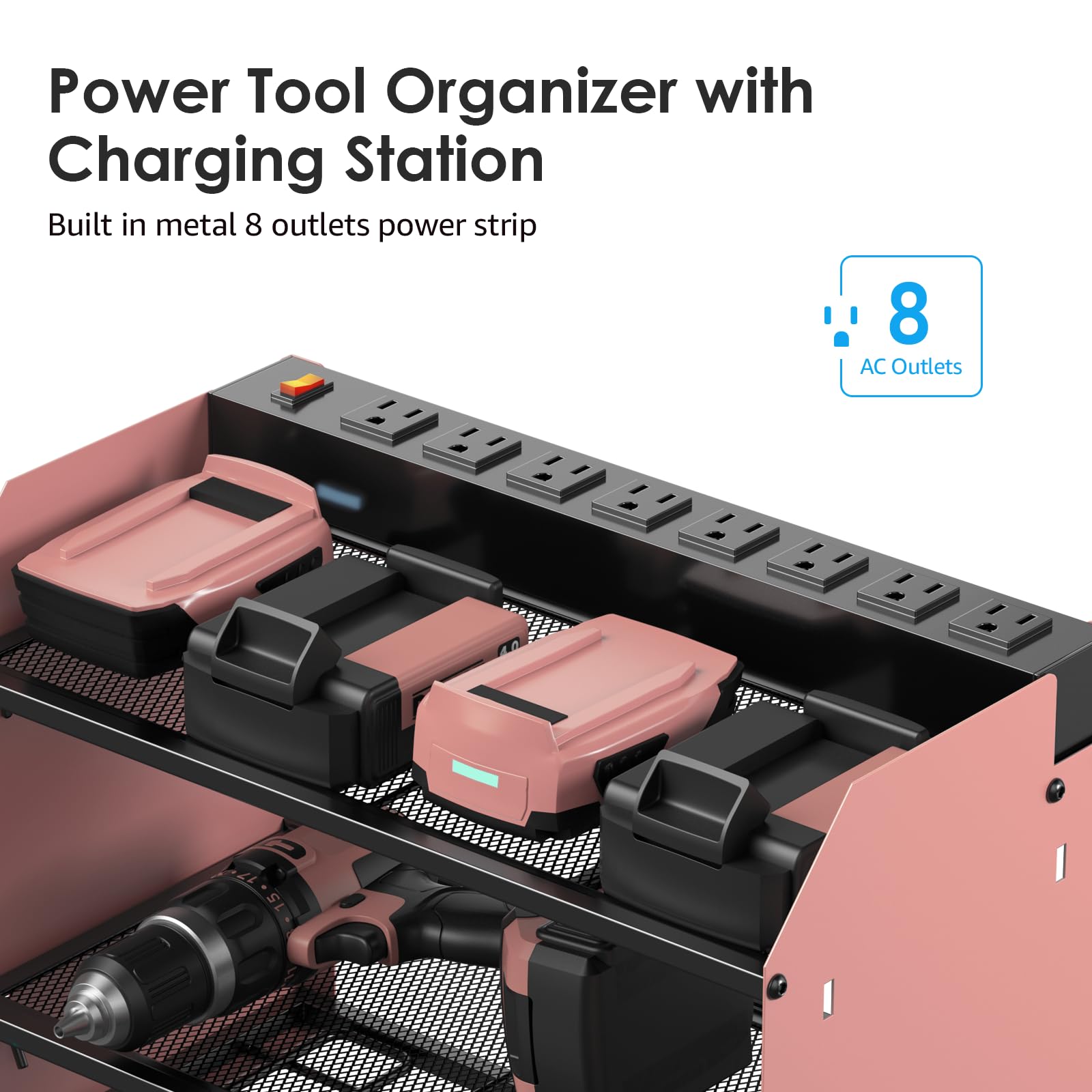 Power tool organizer with charging station, come with 8 outlets. If you have a lot of rechargeable tools, you can charge everything right in the rack and avoid searching for sockets. 6ft power cord included.