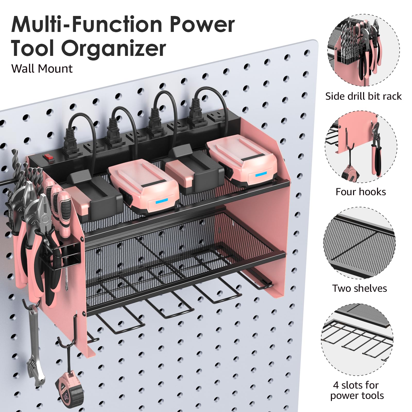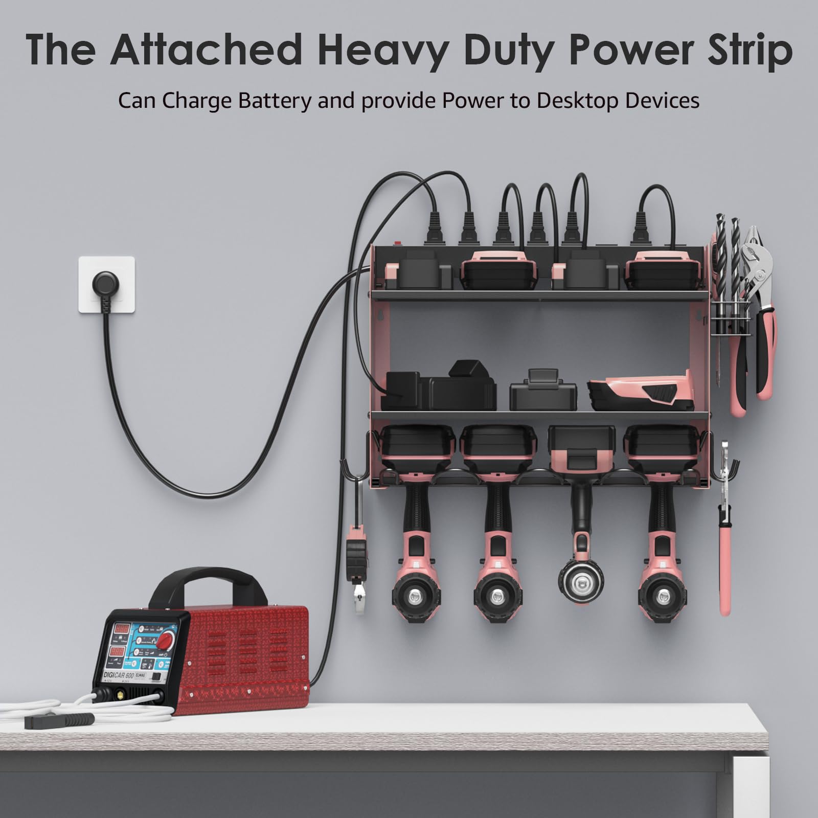 Wall mount power tools organizer come with 4 slots, 4 hooks and drill bit rack, built-in power strip, double layer structure can keep rechargeable tools organized in the work area and save your bench space. The tools in the picture are for demonstration purposes only and are not included.