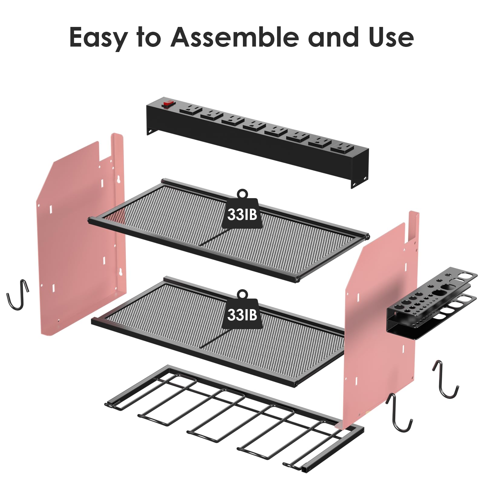 Easy to assemble and mount on a peg board, If you need more storage space, you can connect the two shelves (or more) by screws. Each layer of the grid can support a maximum weight of 33IB. Made from heavy gauge steel. Amazing christmas or father's day gift for men.