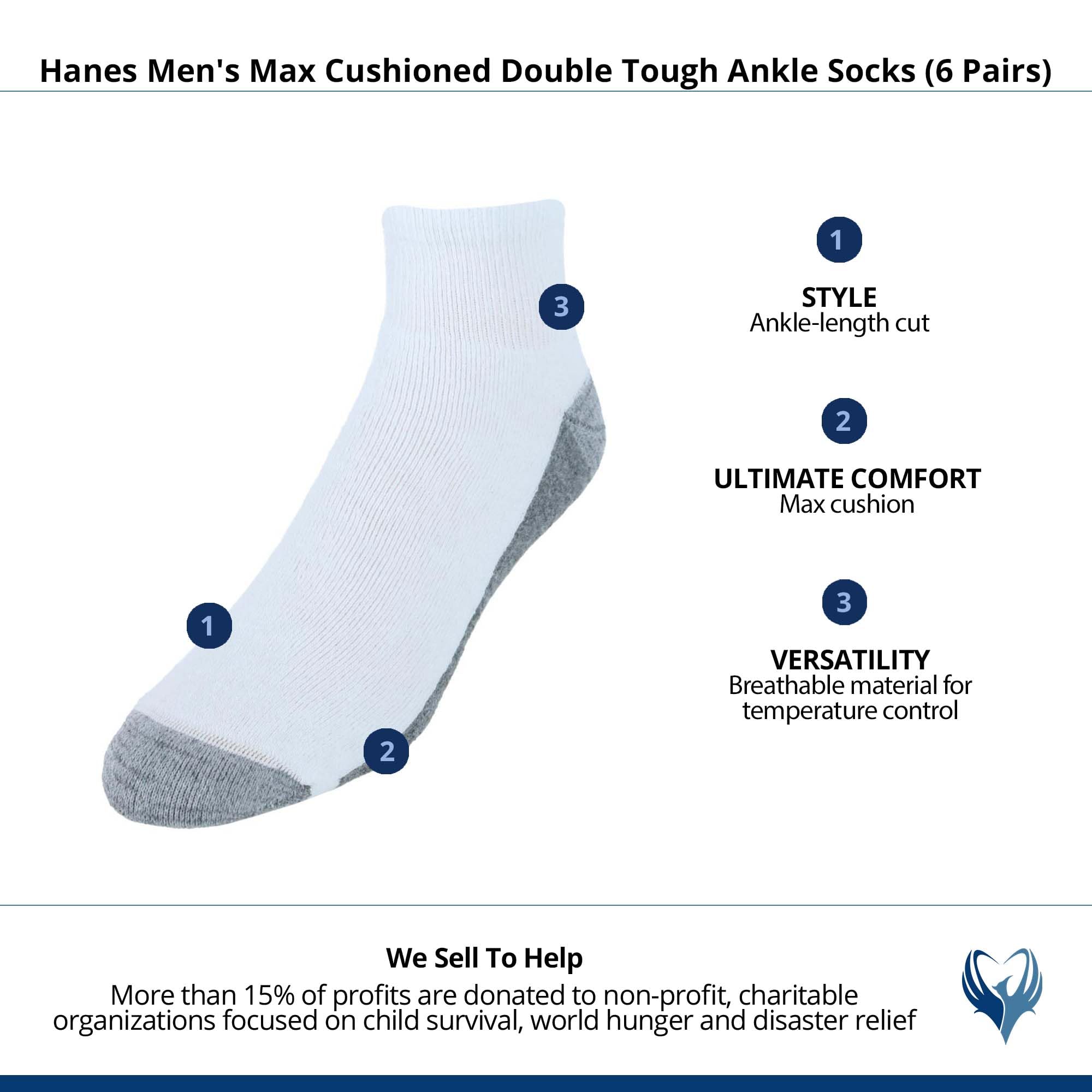 Description Hanes Men's Max Cushion Ankle socks will keep you comfortable all day. These socks are not only comfortable, but are durable as well, with Double Tough Durability. Wicking Cool Comfort Fabric will help keep your feet cool and dry. FreshIQ Advanced Odor Technology helps fight stinky feet! Spandex and Comfort Toe Seam will provide comfort and a better fit.
