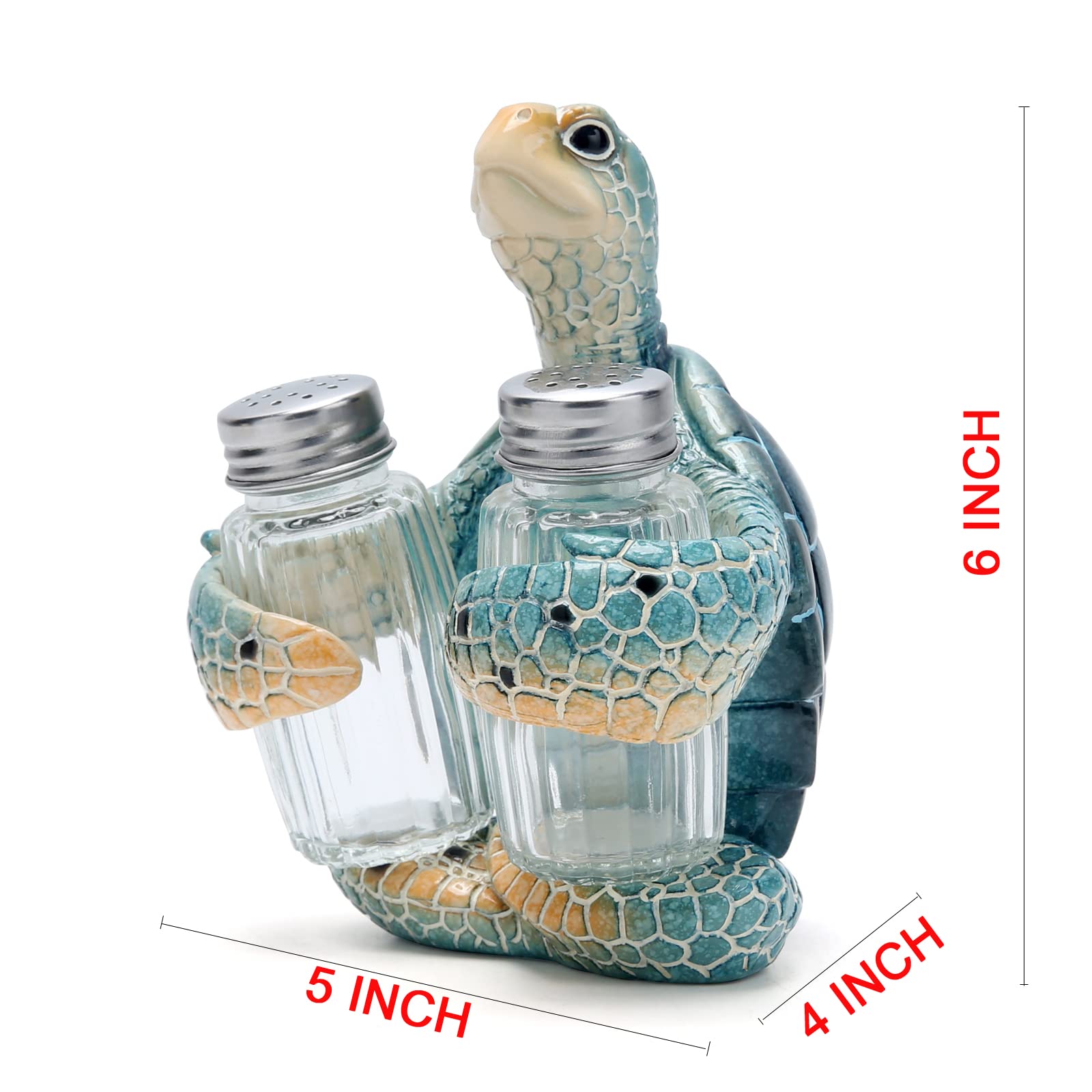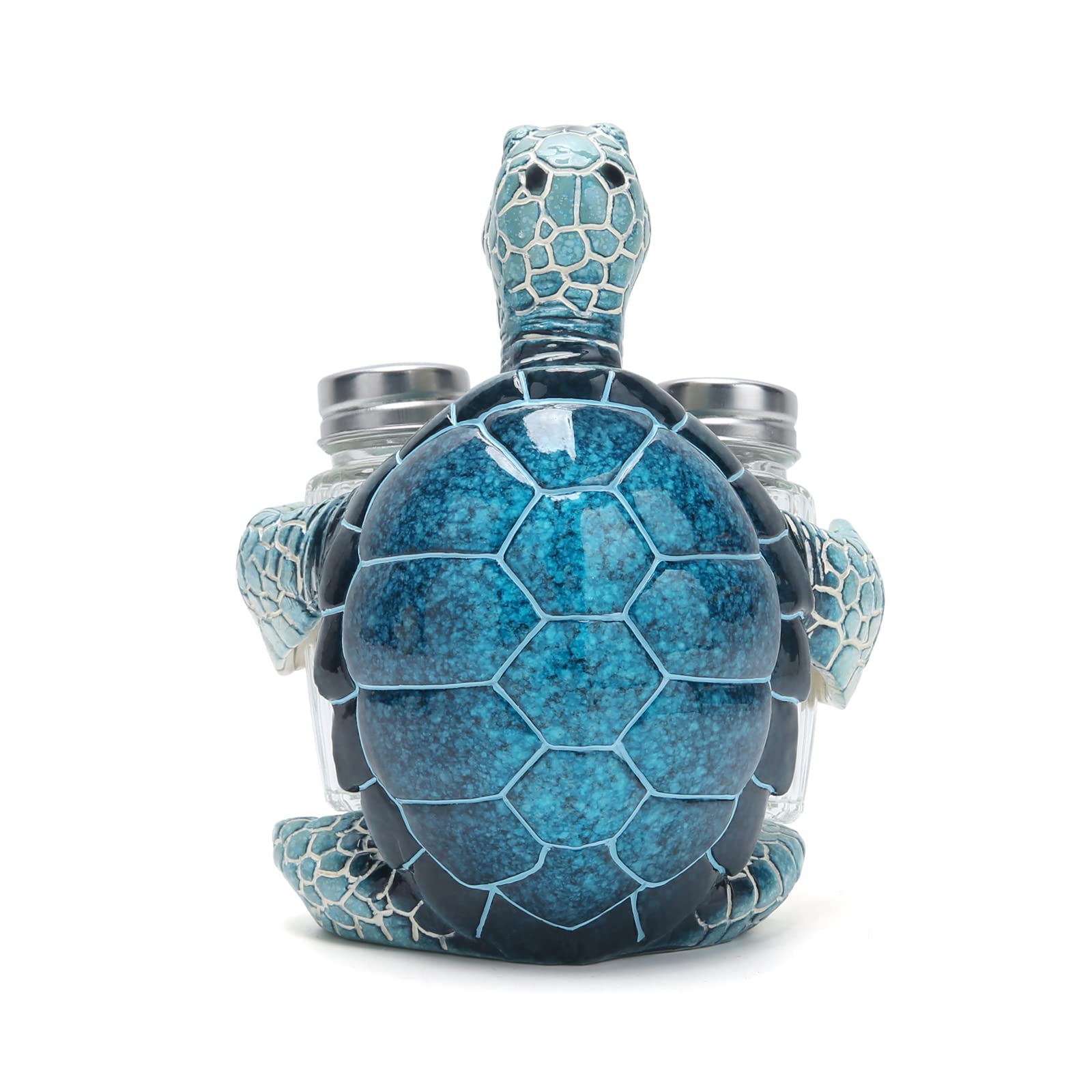 Turtle Sea Turtle Figurines Designs: This is sea turtle with salt and pepper shaker.This charming turtle is ready to join you on your next culinary adventure. The sea turtle's shades of blue will make you feel like you are in the summer ocean. There is a cooling feeling, so that you will not feel the heat of summer.You can use it as a home decoration, or as a kitchen decoration with salt and pepper.This is a good decorations in your home.You also can send them as a present. Your friends will love them.