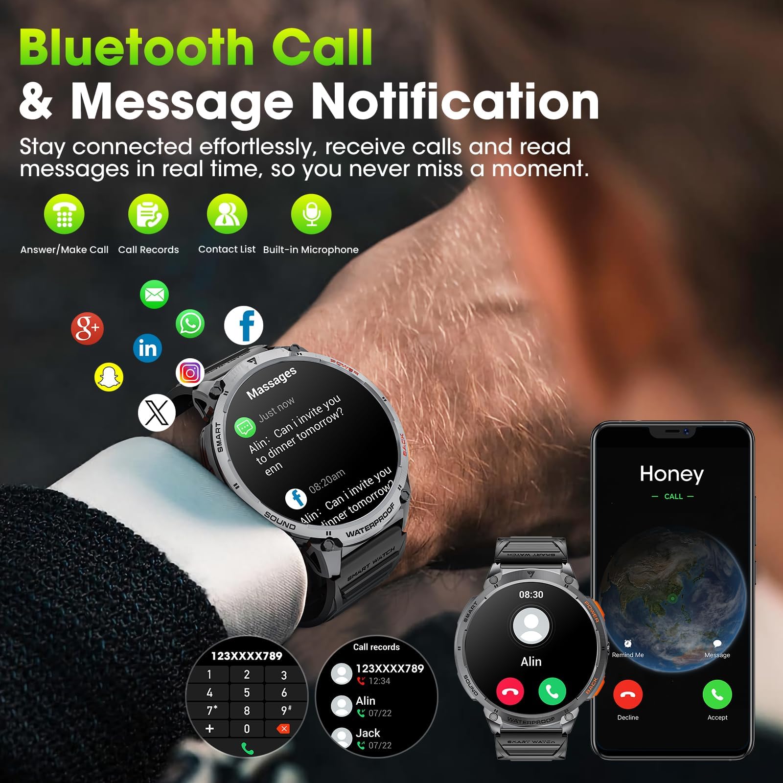 Smart watch with text and call: Stay connected anytime, anywhere with our smartwatches for men and women. Enjoy crisp speaker sound quality to hear the other party clearly. Answer and make calls directly from your wrist, and easily sync your mobile contacts. Our smartwatches receive push notifications from popular apps like Instagram, YouTube, Messenger, Gmail, Snapchat, Facebook, Twitter, WhatsApp, and more. Ios android smart watch keeping you informed without ever needing to pick up your phone. (Note: Message replies are not supported.)