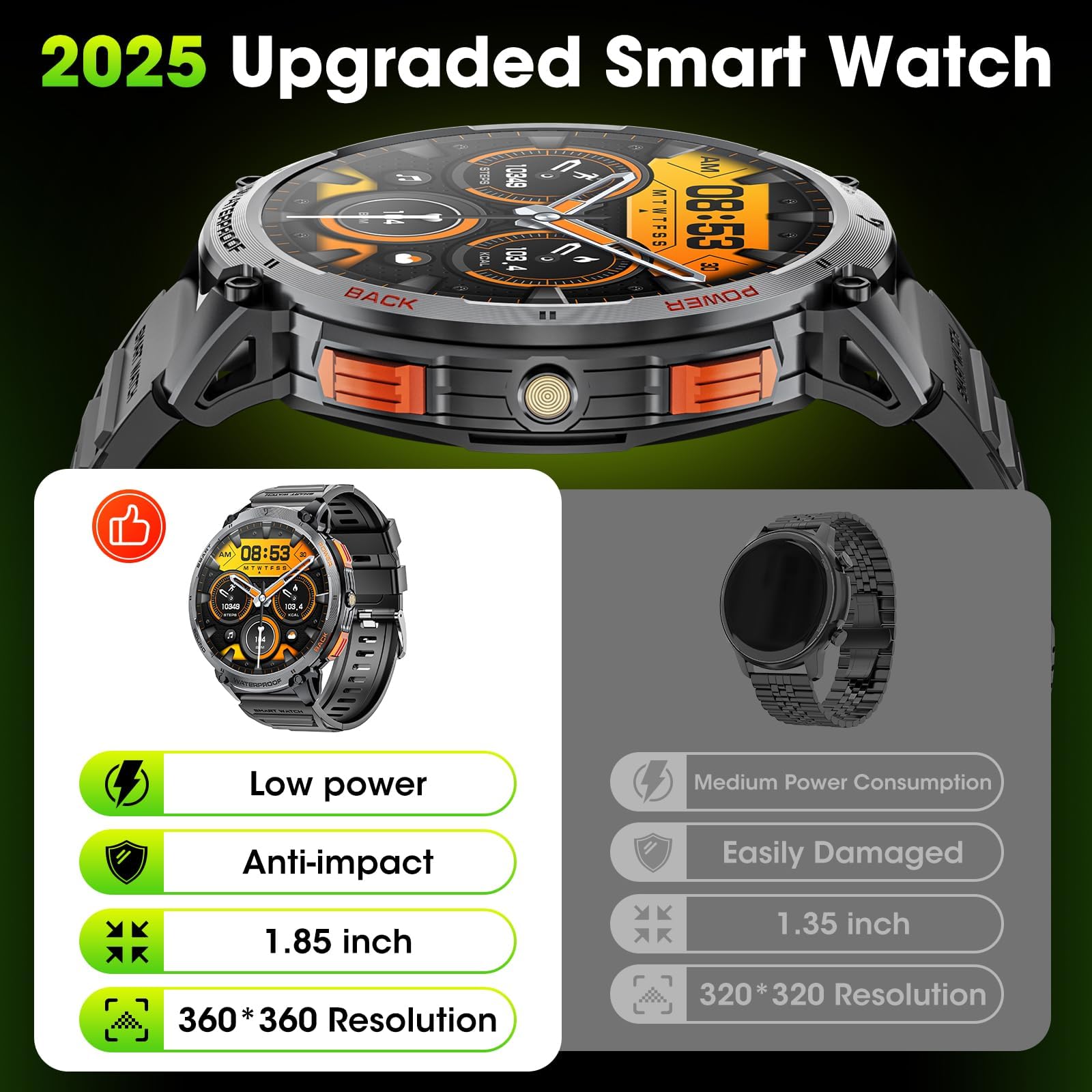 1.85" Large Screen: Enjoy a superior viewing experience with the 1.85" large screen on our military watches for men. The high-resolution display delivers sharp, vibrant visuals, making it easy to read notifications, track fitness metrics, or navigate in any lighting condition. Designed for both rugged outdoor use and everyday convenience, this smart watch ensures every detail is clear and accessible at a glance. Please note: The smartwatch features a 1.85” screen and a case diameter of approximately 55mm, which may not be suitable for those with smaller wrists.