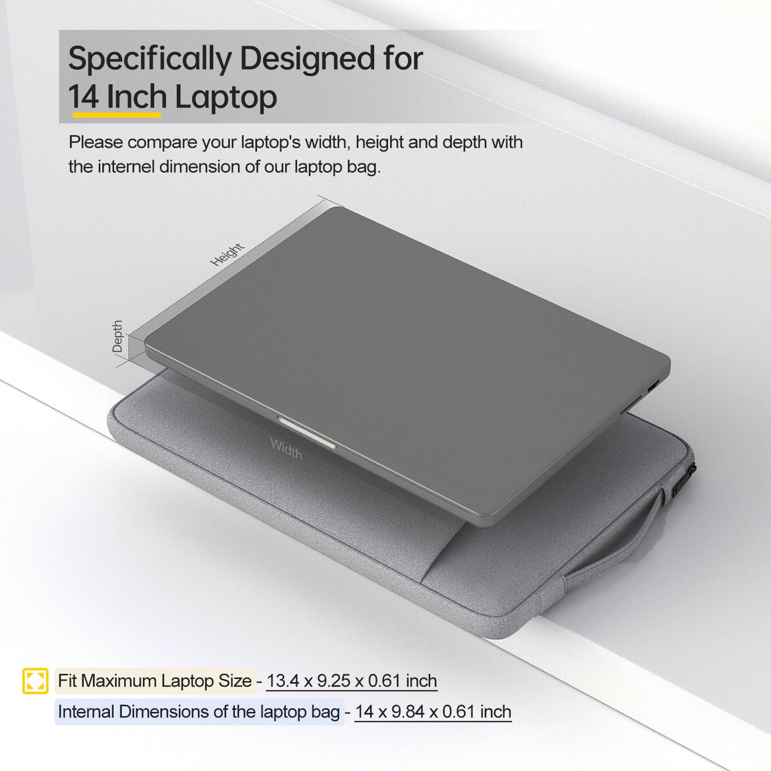 【Measure Your Laptop Internal Dimensions】Internal Dimensions - 14" x 9.84" x 0.61", Fit Maximum Laptop Size -13.4"x9.25". Please measure your laptop less 0.59 inch than the sleeve's internal dimensions in both length and width.