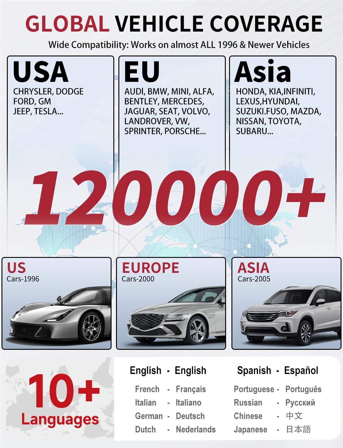Universal Compatibility - Supports 9 OBD II protocols, including KWP2000, J1850 VPW, ISO9141, J1850 PWM, and CAN. Support all OBD2-compliant vehicles from post 1996 US models to newer European and Asian cars. It supports over 10+ languages, including Spanish, Chinese, French, Portuguese, and others.