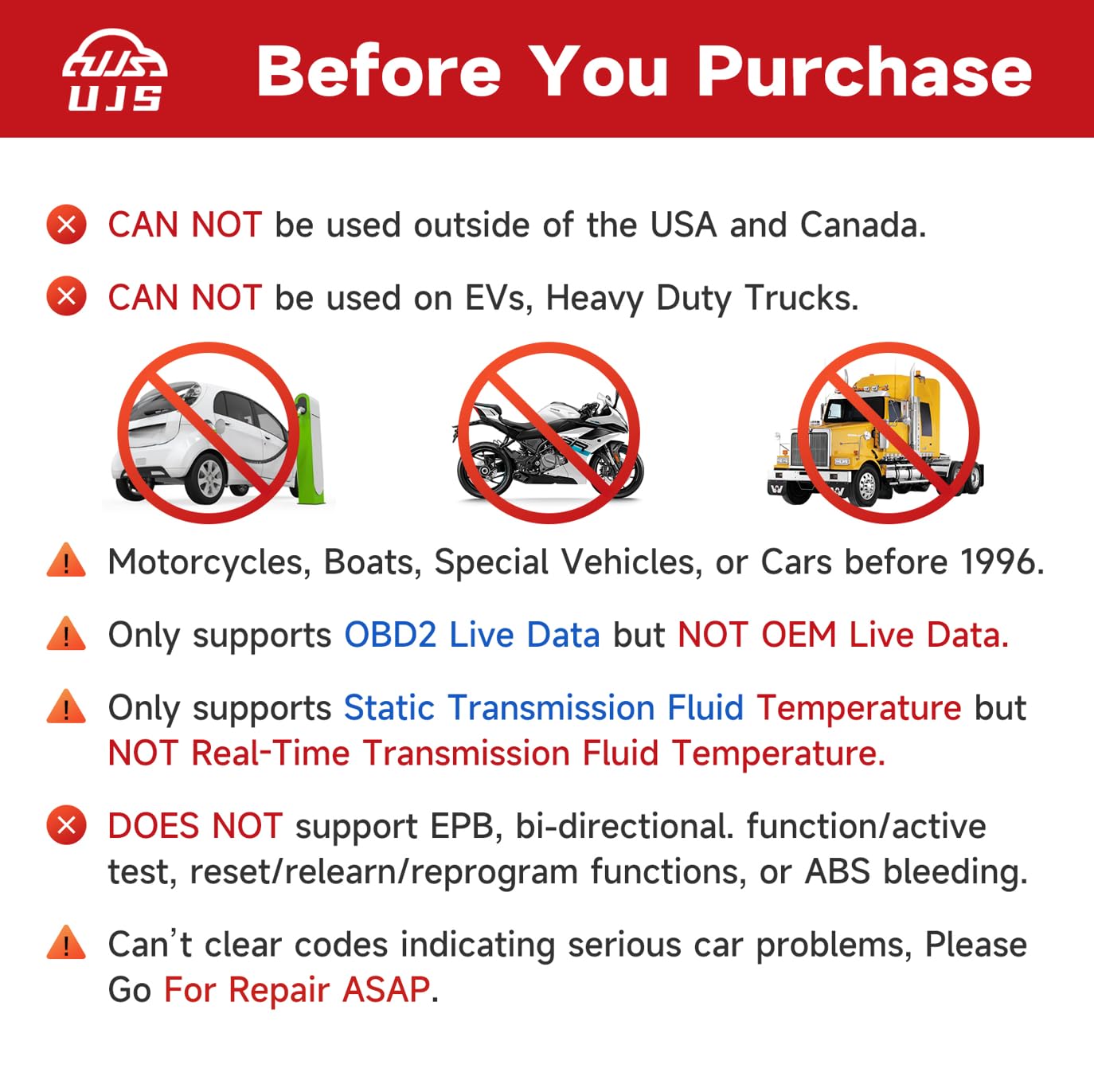 Your Personal CEL Doctor - With over 45,000 built-in DTC lookups, UJS SAFESCAN is designed to quickly identify and tell you the accurate interpretations of your check engine light. Whether you're in your garage or dealing with an unexpected issue on the road, UJS SAFESCAN helps you easily assess your vehicle's condition and understand its health before costly repairs.