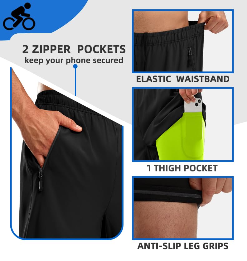 Multily Pockets: Total of three well-made and designed pockets provide a ton of storage, two side zipper pockets and one inner right thigh pocket can keep your phone, keys, wallet and energy gels secured during biking.