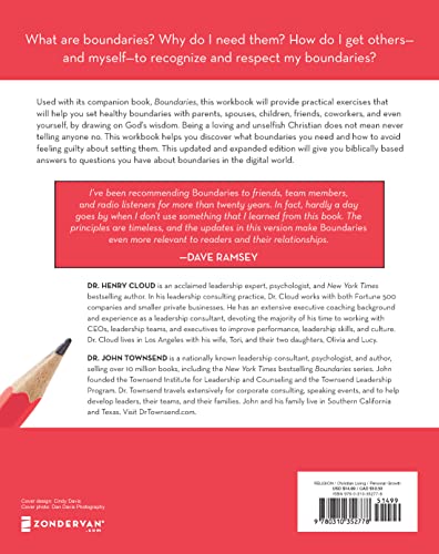 Put healthy, responsible boundaries into daily practice. An essential companion to the bestselling book, Boundaries Workbook provides practical guidance and tools for setting boundaries in the home, workplace, and digital spaces. Following the latest edition of Boundaries chapter-by-chapter, this official workbook's interactive exercises are designed to help you further develop healthy boundaries, resolve conflicts, and log your thoughts, progress, and successes along the way. Additional readings, examples, and situations. Reflection and discussion questions. Journaling prompts. Biblical wisdom with verse references and prayers. Further reading resources. Boundaries Workbook gives you the support and the Scripture you need to help others respect your boundaries—whether you want to improve your work-life balance or you're practicing saying no when someone asks you to volunteer for one more activity. Discover firsthand that having good, biblical boundaries gives you the freedom to live as the loving, generous, fulfilled person God created you to be.