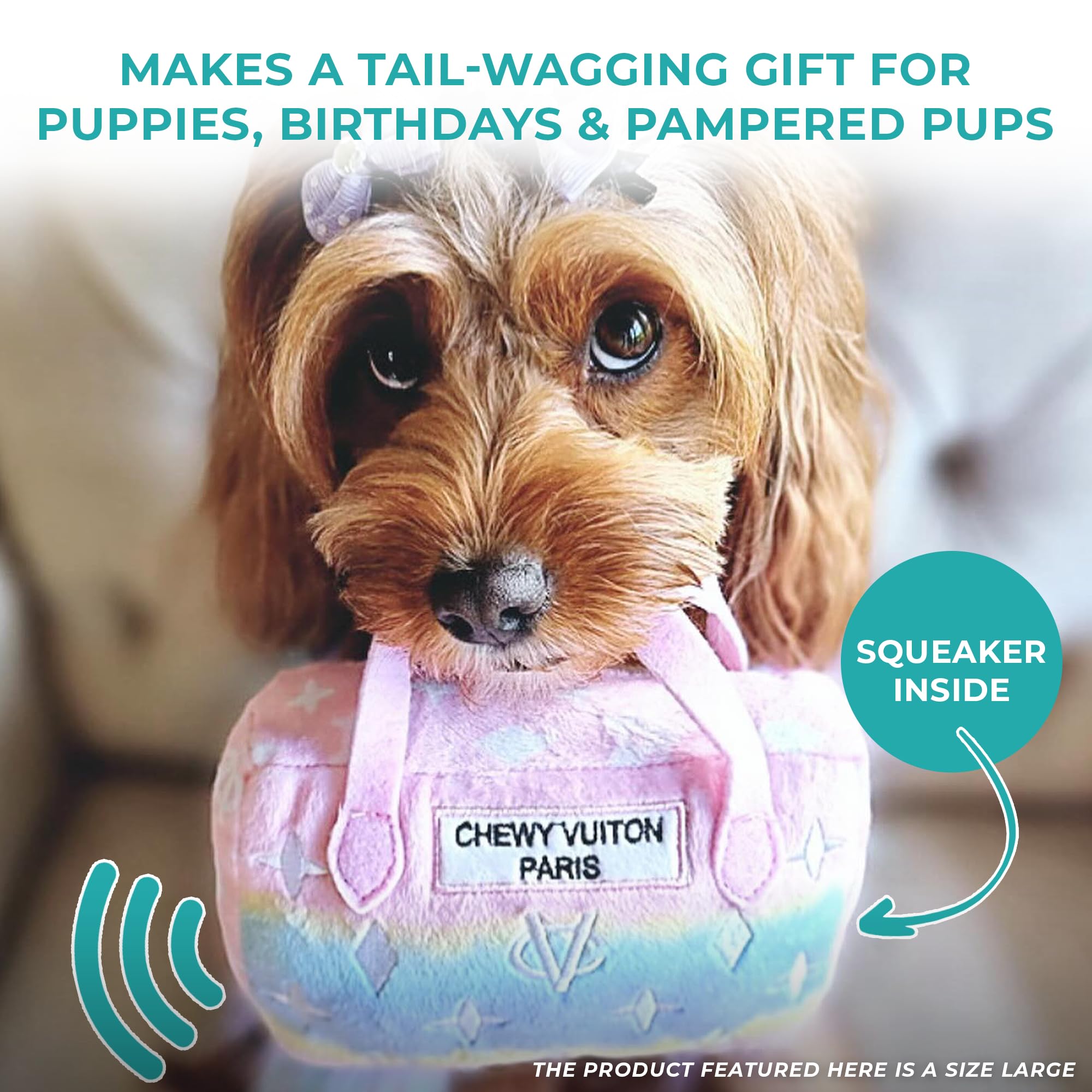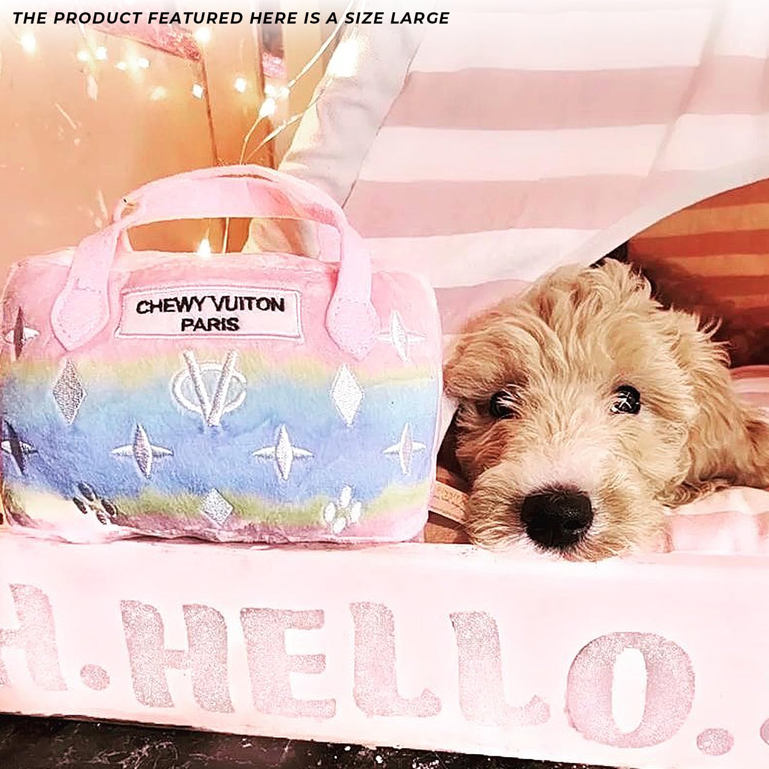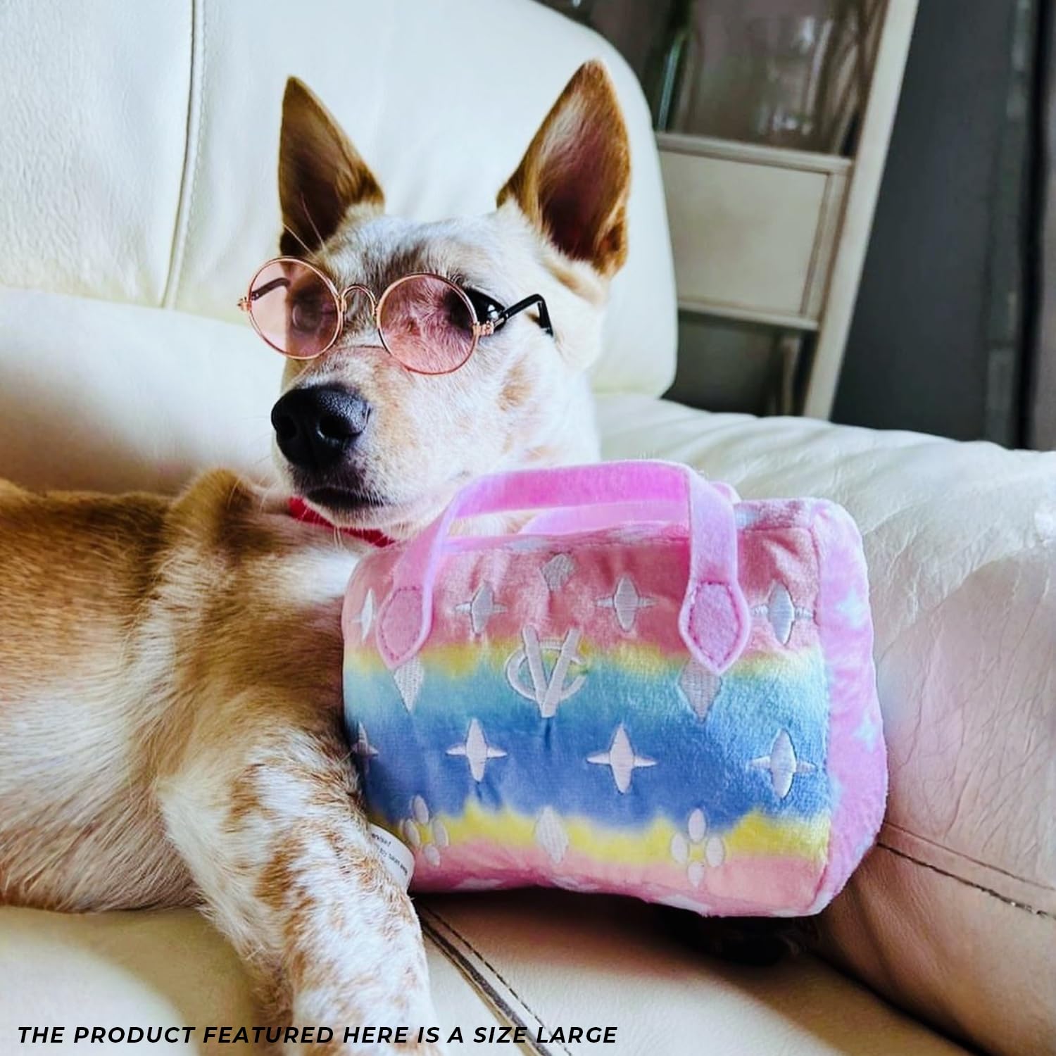 Funny Parody Plush Dog Toy: Let your furry fashionista fetch some fashion-forward fun with this Pink Ombre Chewy Vuiton Handbag dog plush toy, featuring a stylish pink ombre with a white monogram pattern on the soft plush exterior and a built-in squeaker hidden inside; it’s a playful, cute squeaky dog toy that combines style and fun, measuring 6"x5.5”x4”