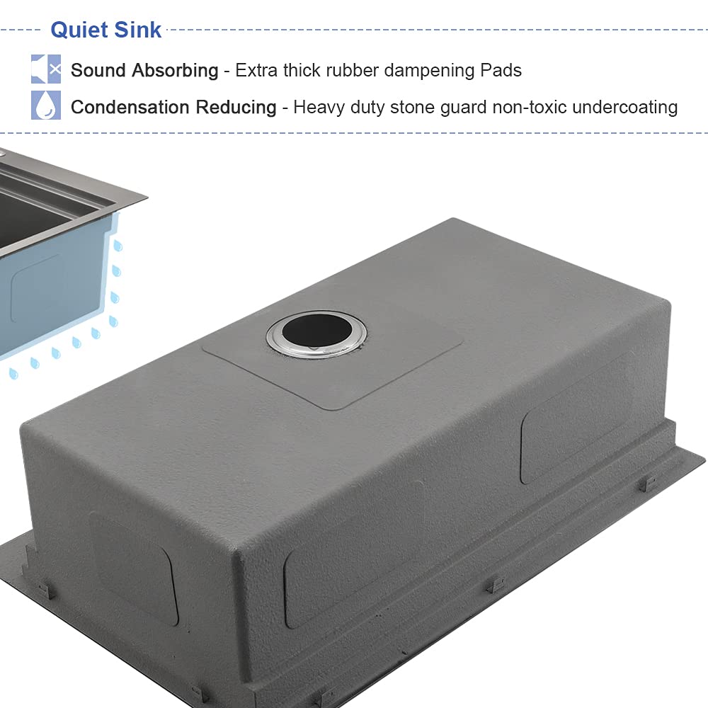 【Black Kitchen Sink Treated for Noise Reduction】:Sound deadening rubber pads installed underside of the black stainless steel kitchen sink ultimately save you from a loud kitchen. And it also protects cabinet from condensation. Draining boiling water, flushing ice or defrosting items won’t damage cabinets.