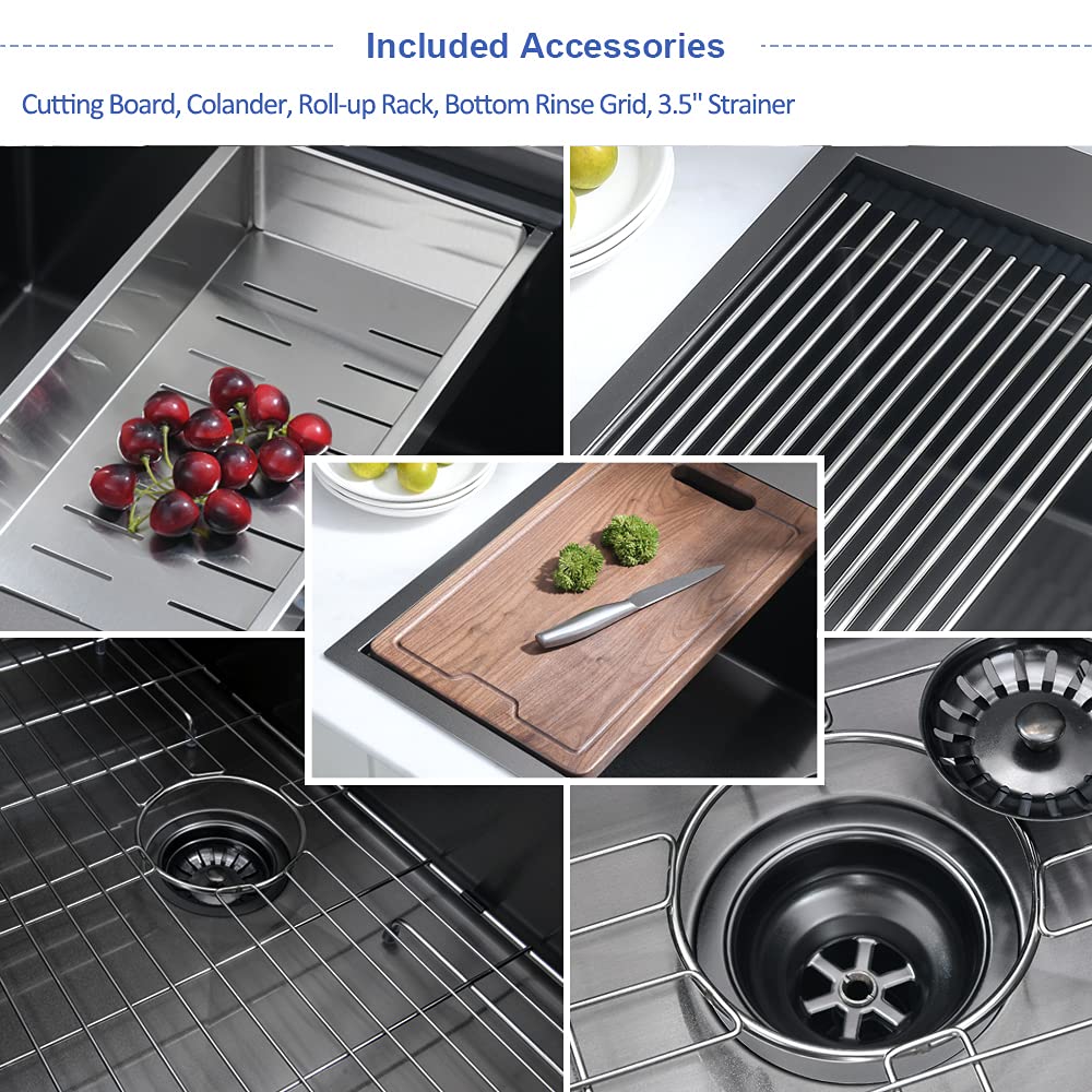 【What’s in the package】:Package comes in 30x22 drop in kitchen sink, wood cutting board, roll-up rack, bottom rinse grid, colander, cutout template, installation clips, 3.5” drain. Dimensions: EXTERIOR: 30"(L) x 22"(W) x 10"(D); NOTE: Sink looks more of dark gray instead of black, please note it before buying.