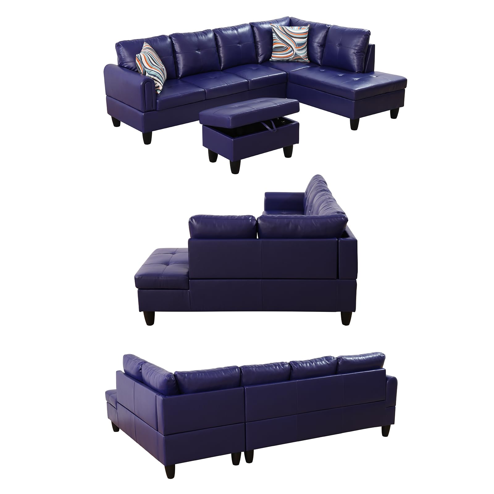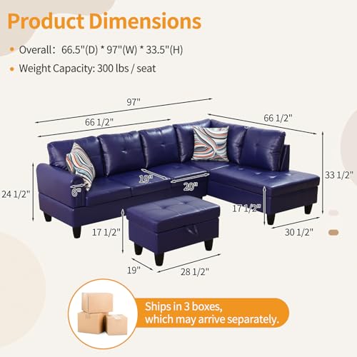 Product Overview Description / Features 3-Piece Sofa Set (Sofa + Chaise + Ottoman). Designed with modern clean lines and upholstered in premium faux leather, this set easily complements a variety of home styles, making it perfect for living rooms, apartments, or entertainment areas. Stability & Durability: Constructed with a solid wood frame and reinforced with metal connections, ensuring stability and long-lasting use. Premium Upholstery: Breathable faux leather is waterproof, scratch-resistant, non-cracking, and easy to clean. It mimics the touch of genuine leather while maintaining superior durability. Superior Comfort: Double-layer spring support with high-density sponge cushions provide excellent elasticity, balanced support, and lasting comfort for daily relaxation. Functional Storage Ottoman: The ottoman includes a hidden storage compartment, perfect for organizing blankets, magazines, or other essentials. Multi-Use Design: Sofa and chaise can be placed together as a sectional or separately to suit different room layouts and usage needs. Easy Assembly: Simple setup with included tools and instructions. Caution *** Please do not open the compressed cushions until your sofa frame is completely assembled, otherwise it cannot be repacked in the original way for return. *** Please review the product dimensions to ensure it fits your room before purchase. *** Color may vary slightly due to lighting or monitor display; this is not a quality issue.Product Details Weights & Dimensions Sofa: 66.5” W x 30.5” D x 33.5” H Chaise: 66.5” W x 30.5” D x 33.5” H Ottoman: 28.5” W x 19” D x 17.5” H Product Weight: 189.75 LBS (Sofa 82.8 lbs / Chaise 82.8 lbs / Ottoman 24.15 lbs) Gross Weight: 212.75 LBS (Sofa 92 lbs / Chaise 92 lbs / Ottoman 28.75 lbs) Carton Size: Sofa: 66.5” x 29.5” x 12.5” – 92 lbs Chaise: 66.5” x 29.5” x 12.5” – 92 lbs Ottoman: 28.5” x 18.5” x 12.5” – 28.75 lbs Specifications Product Type: Sofa Set (3 Pieces: Sofa + Chaise + Ottoman) Shape: L-Shaped Sectional (Modular) Number of Pieces: 3 Seating Capacity: 3-4 Upholstery Material: Faux Leather Seat Fill Material: High-Density Sponge & Double-Layer Springs Back Fill Material: Sponge + Spring Support Frame Material: Solid Wood + Metal Leg Material: Plastic legs Back Type: Cushion Back Arm Type: Square Arms Wood Species: Mixed Solid Wood Weight Capacity: 1000 LBS Product Care: Wipe clean with a damp cloth; do not use harsh cleaners Intended Use: Residential Use Country of Origin: China Shipping: Courier Delivery Assembly Assembly Required: Yes Level of Assembly: Partial Assembly Assembly Time: 30-45 Minutes Adult Assembly Required: Yes Suggested Number of People: 2 Additional Tools Required: All tools included