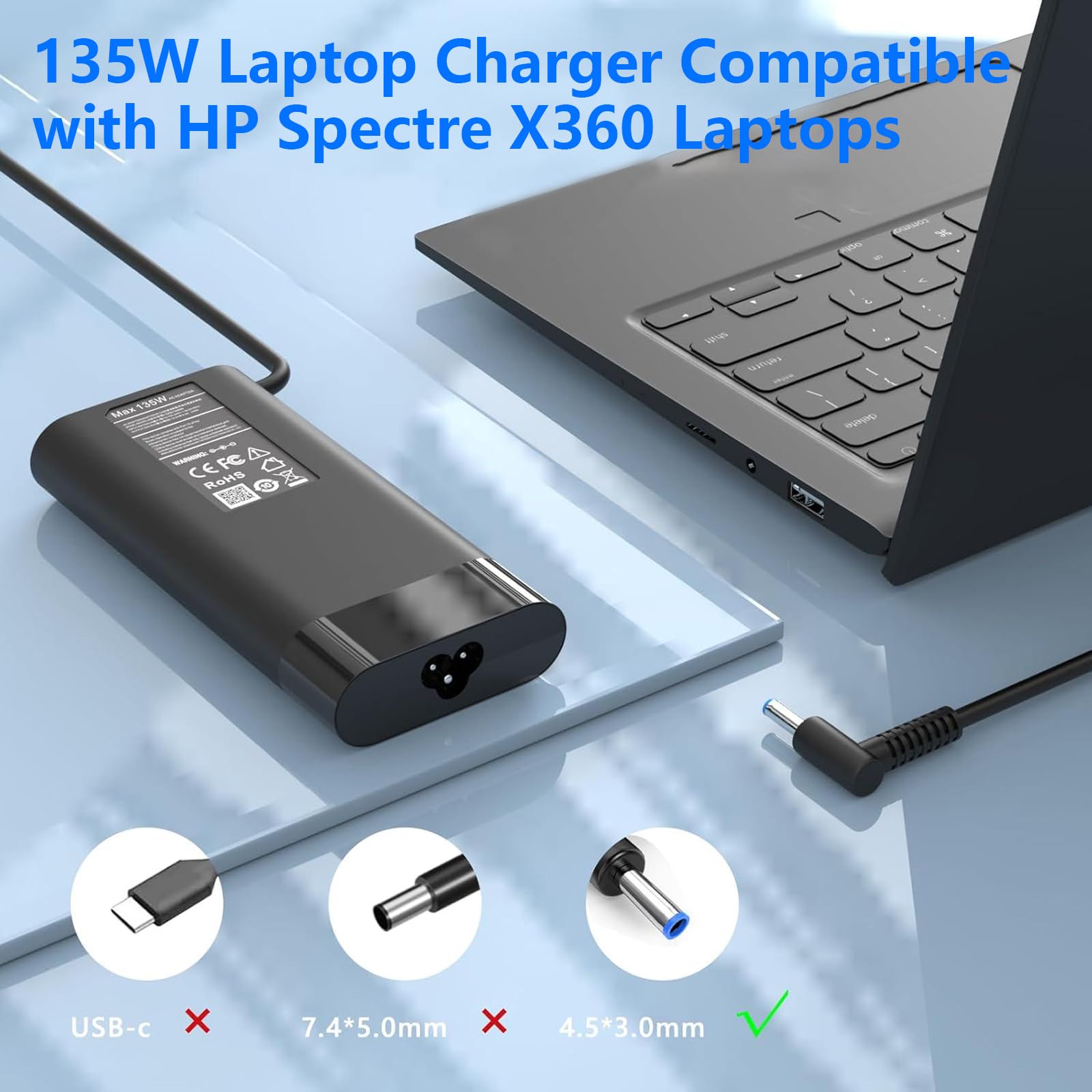SPECIFICATIONS: Input: 110-240V 50-60Hz, Output Max: 19.5V 6.9A 135W Compatible with hp spectre x360 charger Blue 4.5x3.0mm tip.