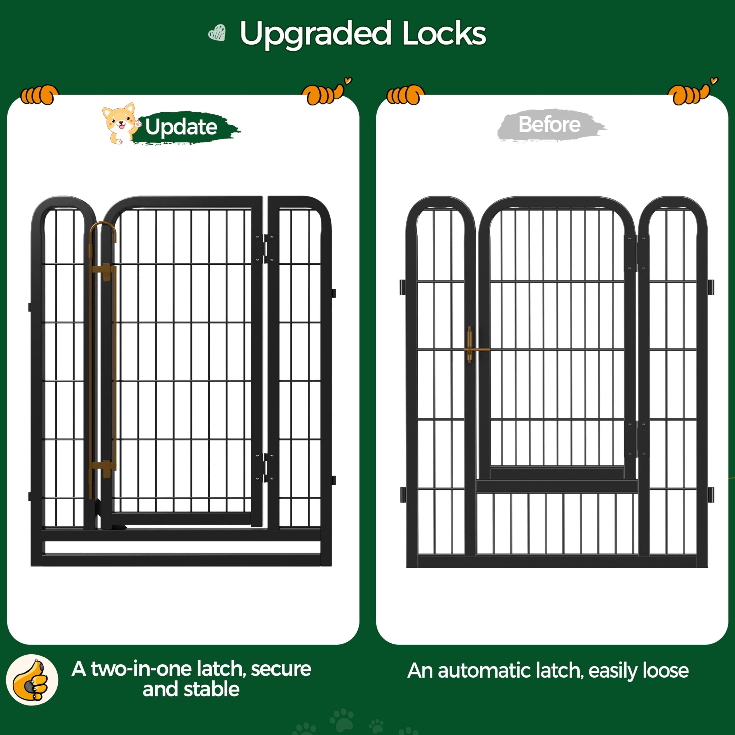 Safety & Security: Ensuring the safety of your pets is of utmost importance. This exercise pen is crafted with appropriate bar spacing and the latches lock automatically as you close the door. Rounded edges also protect animals and wooden or PVC floors. Additionally, stakes anchor the panels firmly to the grass or soft ground