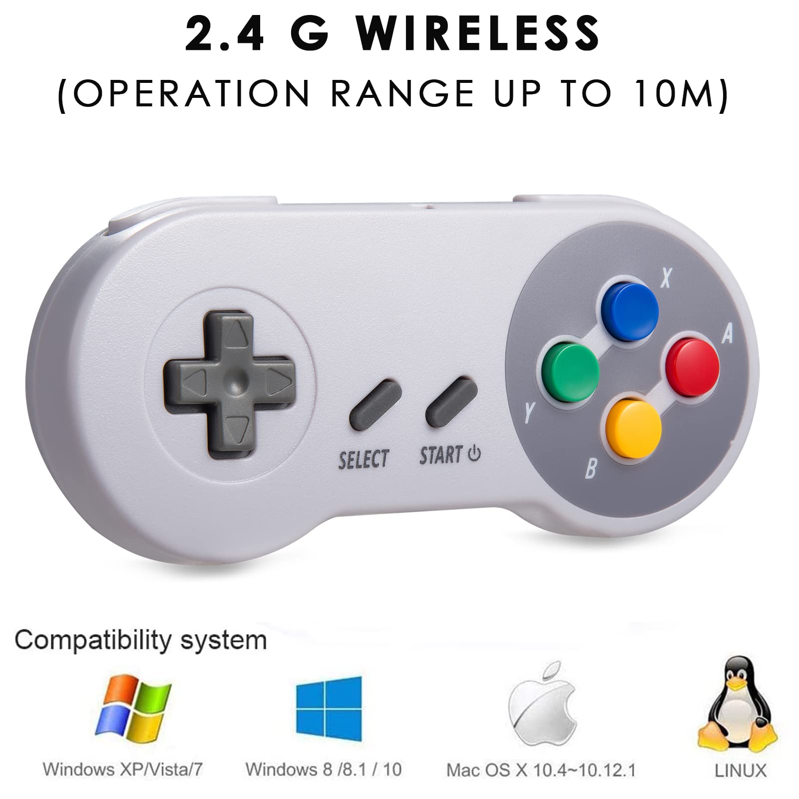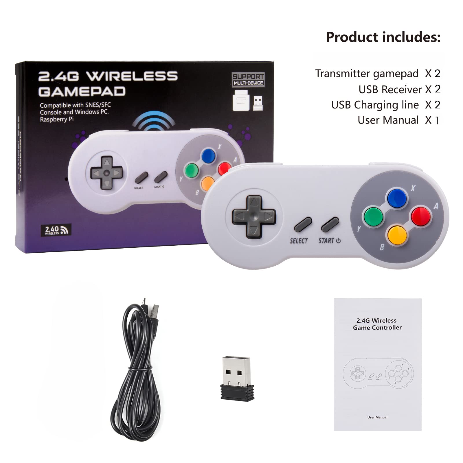 Widely Compatibility It works with most SNES games on the computer very well,such as Contra,Megaman X,Super Metroid,Mortal Kombat 2,Super Mario World,Super Mario Kart etc,bring you real retro feels. You can directly use these SNES controllers on your Raspberry Pi device,such as Raspberry Pi /Raspberry PI 2 model B /Retro Pi OS/Raspberry Pi Zero/Raspberry Pi 3 How to use the wireless controller on computer: 1)When you first pair the controller, press the START button, the red LED light will blink slowly. 2)Press the START button again,the red LED will flash rapidly indicating the controller is ready to pair. 3)Plug in the USB receiver to the device,the controller will auto reconnect to your Windows device 4)By switching to X-input(SELECT+START) and D-input mode(SELECT+START) (press hold SELECT+START for 5 seconds to enter pairding mode.) Great wireless rechargeable controllers ❶No input lag,plug and play, no installation hardware. Quick and Easy to settings the buttons function. ❷The controller includes a standard USB cord for recharging it,you don't have to worry about replacing batteries. ❸The top of the controller has an LED that changes to red when it needs to be charged. Reset your classic wireless controller via button command:Down+Start+Select Notice: 1) The SNES Controller is a third-party controller, Non-OEM,DO NOT SUPPORT Android TV BOX, ONLINE steam game 2) If you encounter any problems during use, please contact us. 100% customer satisfaction guarantee. 3)Built in lithium battery, controller contains (500 MAH lithium battery), which can work for 3-4 hours after charging, saving the trouble of installing battery What's in the box: 2* 2.4G wireless snes usb Controller 2* 2.4G Wireless Receiver 2*USB Charging Cables 1* Instruction manual