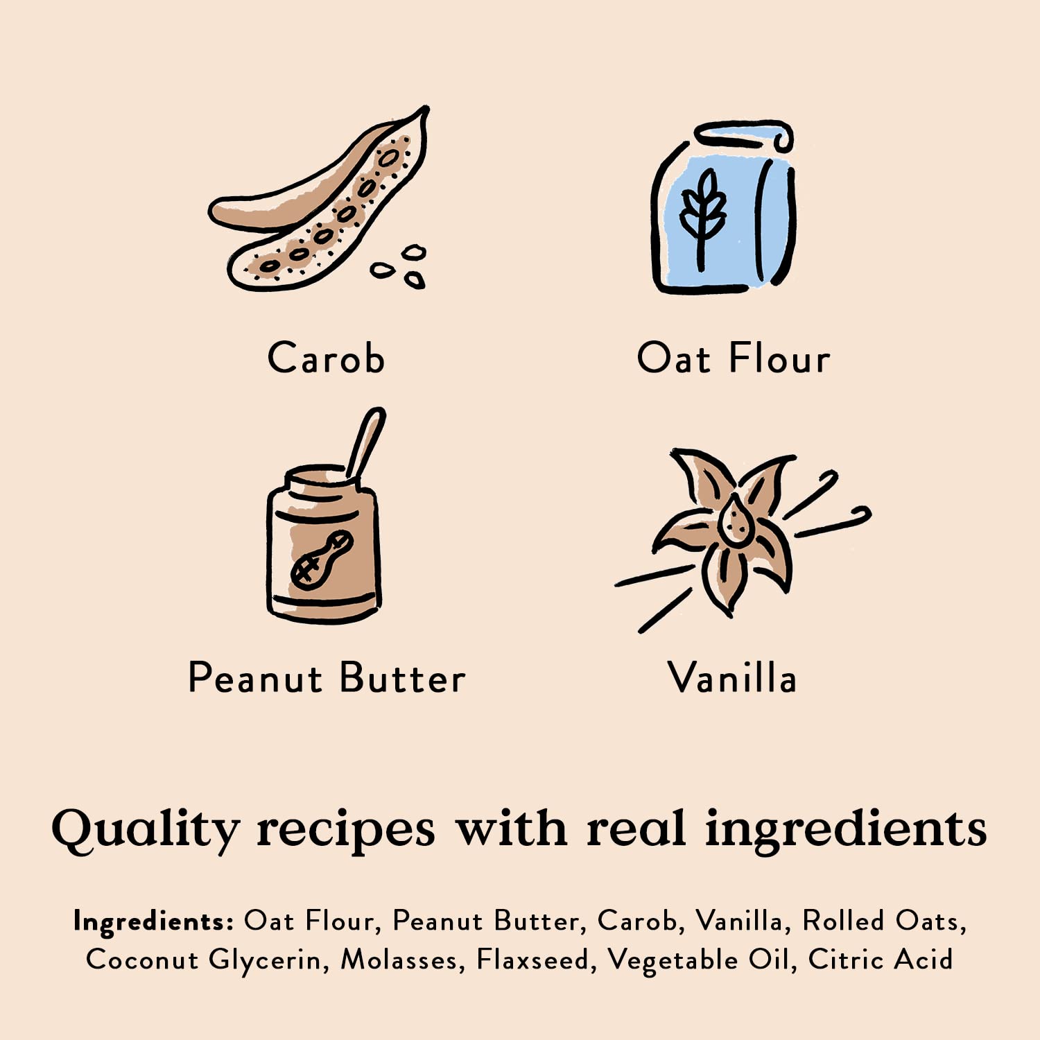 We’ve made a softer cookie with limited ingredients and all-natural preservatives. Perfect for pups looking for a chewier bite. Ingredients: Oat Flour, Peanut Butter, Carob, Vanilla, Rolled Oats, Coconut Glycerin, Molasses, Flaxseed, Vegetable Oil, Citric Acid; Guaranteed Analysis: Protein: 10% Fat: 12% Fiber: 3% Moisture: 8% ; Calories: 14 cal/treat