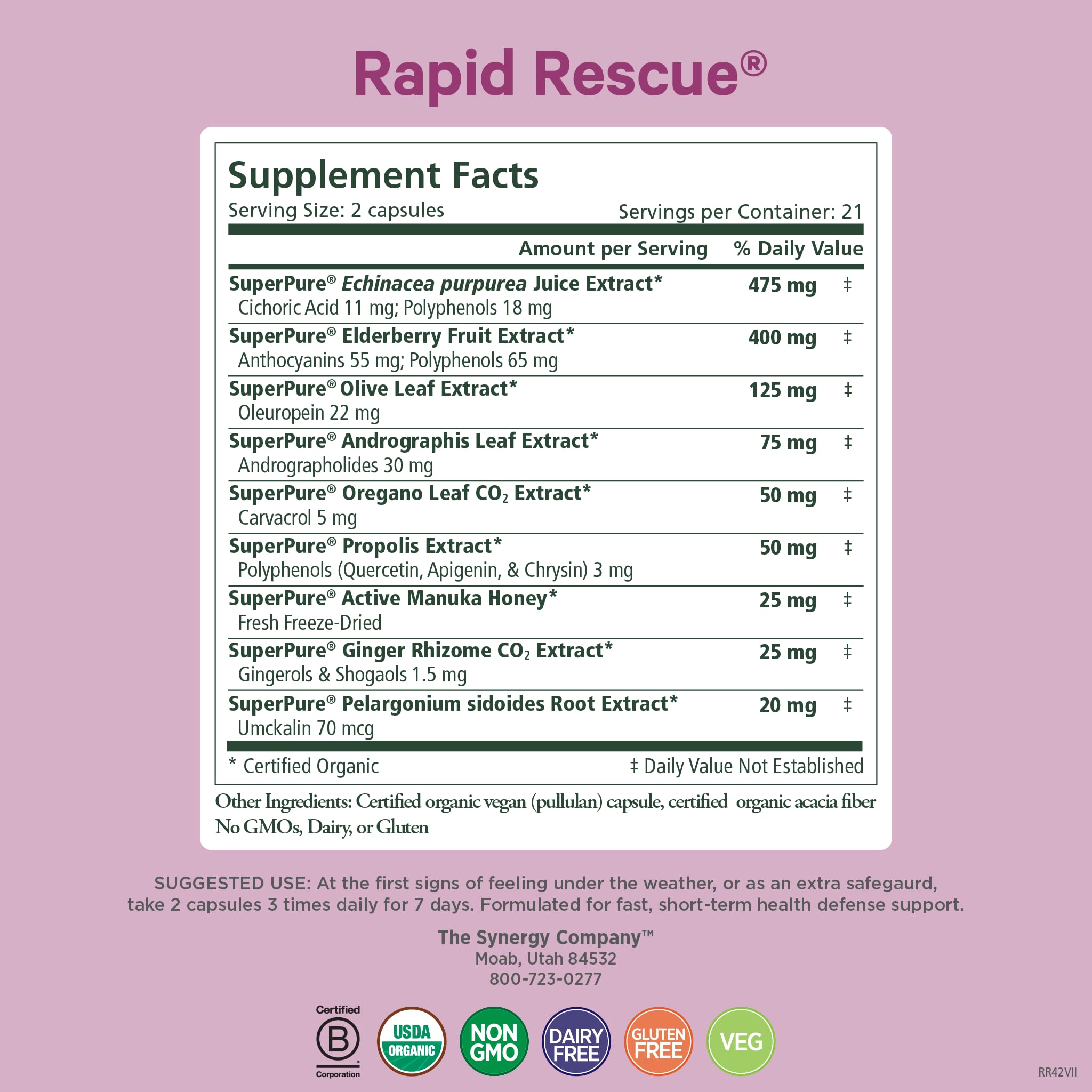 RAPID IMMUNE SUPPLEMENT: Each bottle (42 capsules) delivers rapid immune support with 9 herbal extracts including echinacea, elderberry, olive leaf, and oregano plus potent Manuka honey.