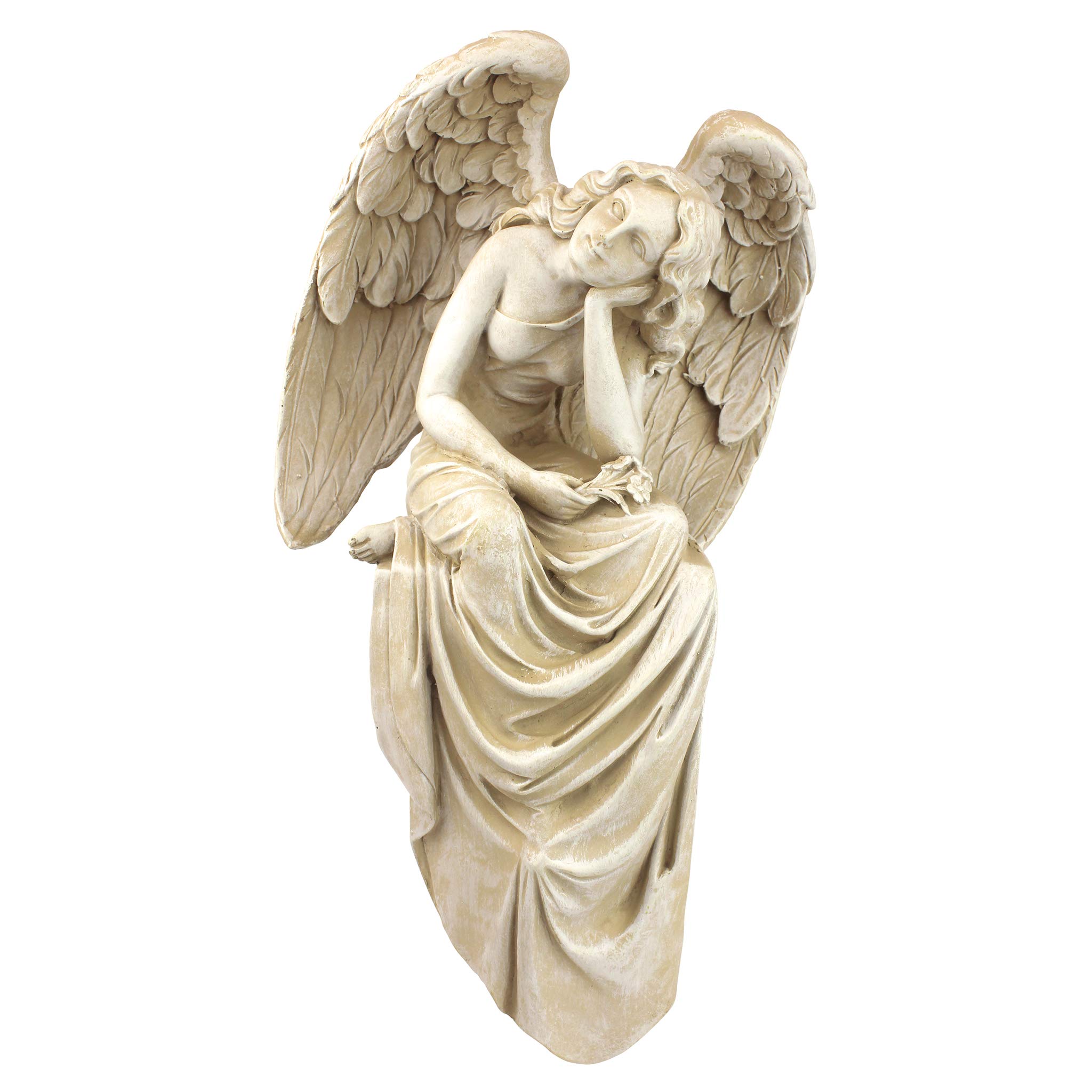 If contemplation is an art, then this peaceful angel is a masterpiece! Resting, head in hand, she is easy to admire - from her feathered wings to the dainty toes peeking from beneath the folds of her exquisitely sculpted gown. Cast in quality designer resin and finished in faux stone exclusively for Toscano, this fine sculpt is an investment in classic art whether she sits atop a garden wall or is perched on a sunny window ledge. Medium: 8½ "Wx6"Dx15"H. 3 lbs.