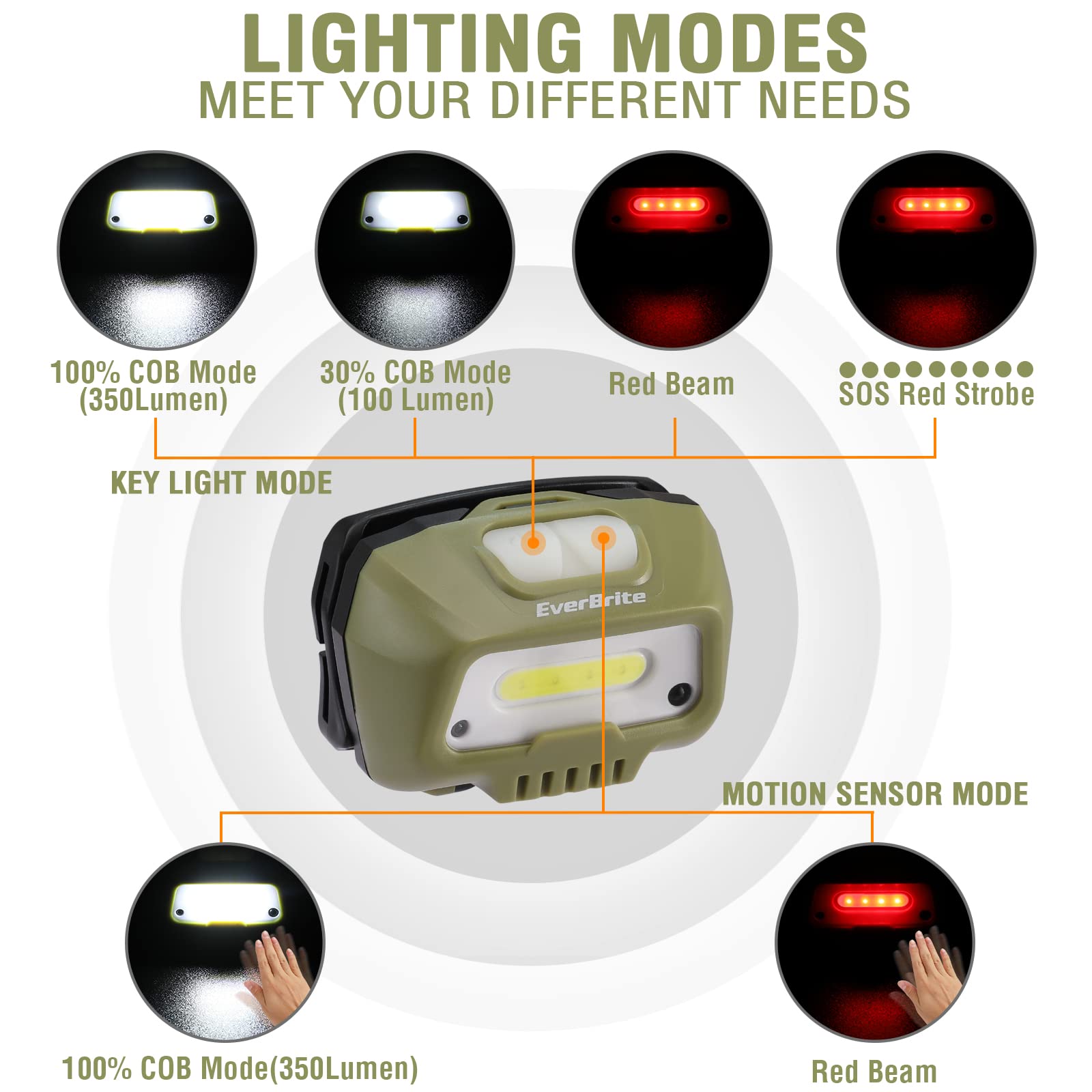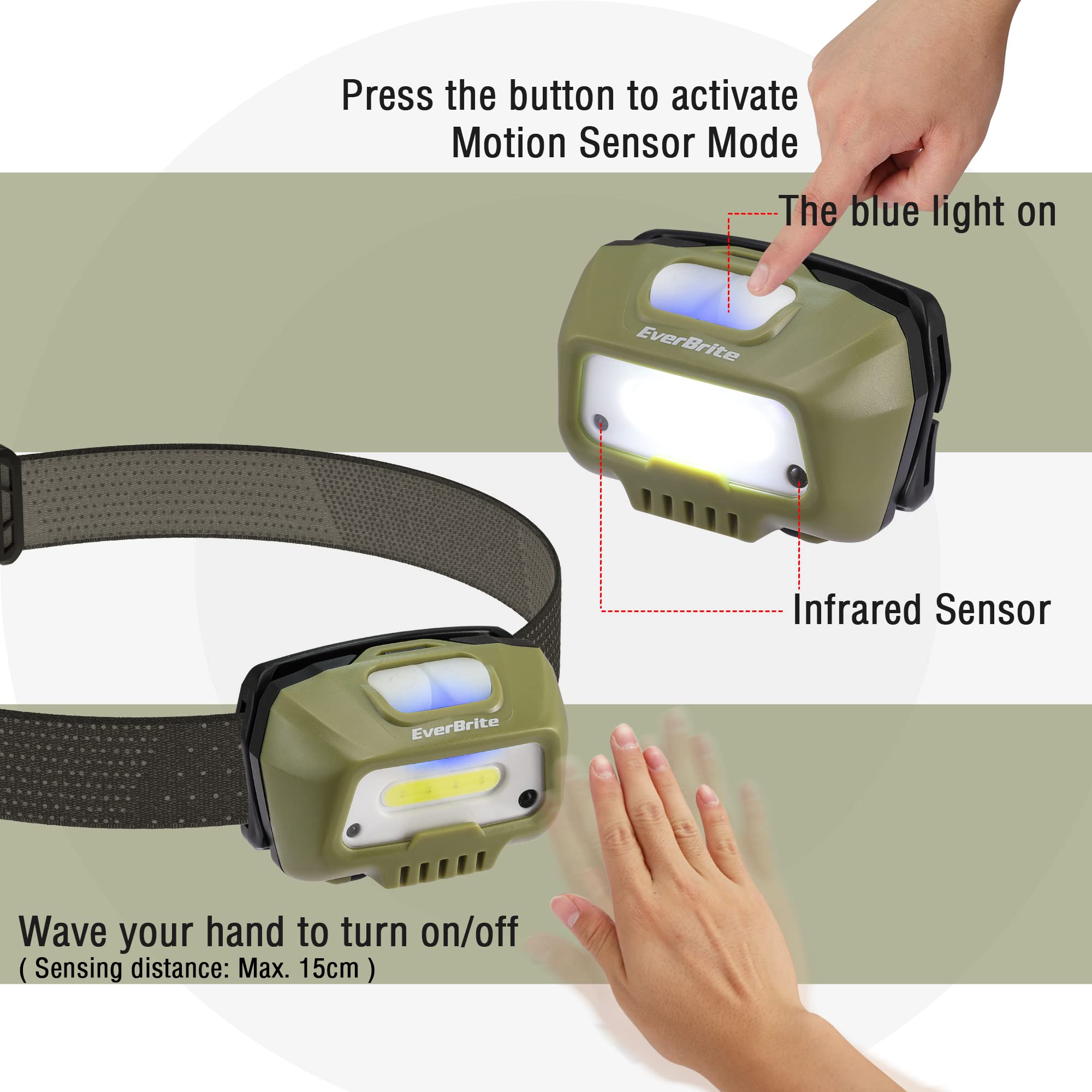 6 Lighting Modes & Motion Sensor: This led headlight has 6 different working modes to meet the lighting needs on various occasions. It has motion sensor mode, you can easily turn the lights ON/OFF by waving your hand. In key light mode: 100% COB Mode(350Lumen), 30% COB Mode(100 Lumen), Red Beam, SOS Red Strobe. In the motion sensor mode: 100% COB Mode, Red Beam. In any mode, if the light is on for more than five seconds, press the power button to turn off the light directly