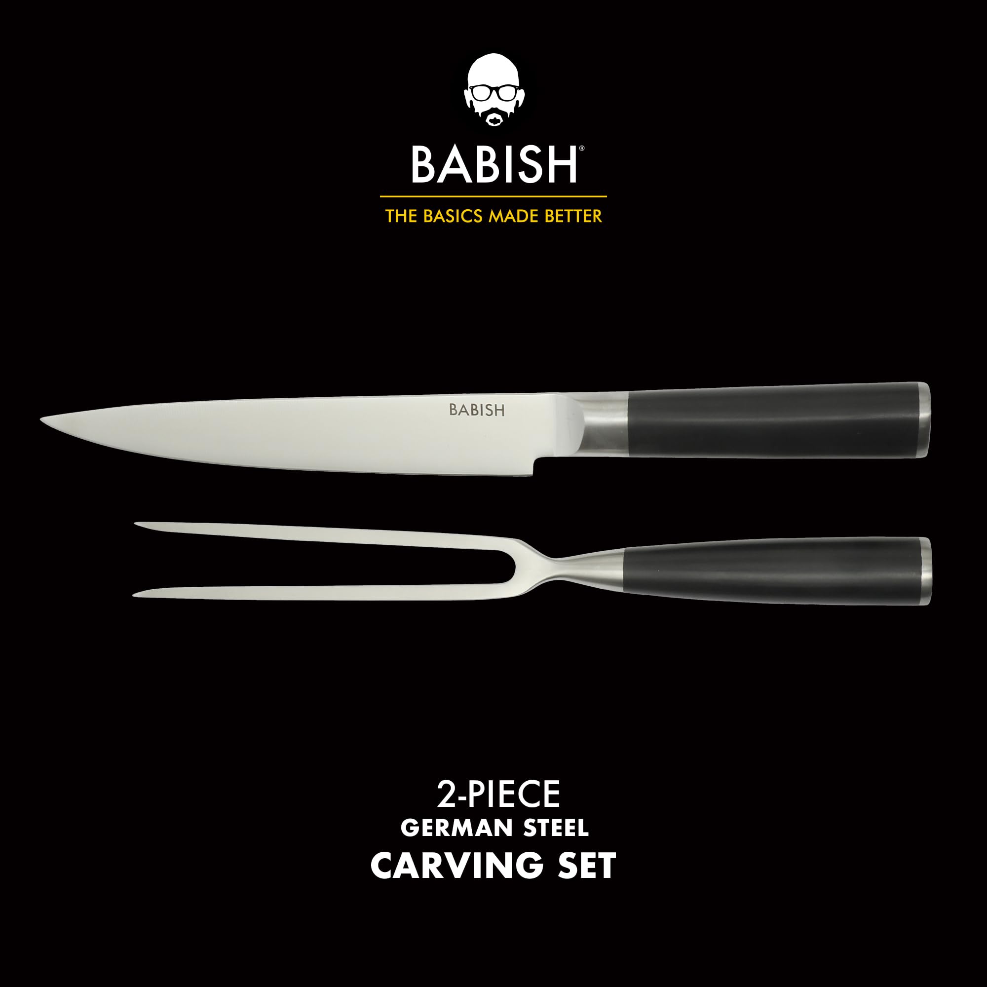 For smoked briskets, roasted birds, and everything in between, this 2-piece German Steel Carving Set from Babish handles tender, flavorful meat with care and precision. The forged German steel construction maintains maximum sharpness and offers superior rust resistance to withstand the demands of everyday use and holiday roasts. Full-tang blades provide even weight distribution for better support and control. Masterfully crafted to yield clean slices every time, this carving set is a reliable choice for ensuring safety and efficiency—whether the pitmaster is serving thinly sliced brisket or the guest of honor is upholding the family's Thanksgiving traditions. Hand wash only. Andrew Rea is one part chef, one part filmmaker, and a generous dash of irreverent Youtube personality. Self-taught both behind and in front of the camera, his Youtube channel, Babish Culinary Universe, is enjoyed by millions of burgeoning chefs and foodies around the globe. His passion for teaching and experimenting in the kitchen is rivaled only by his love of film and television, both of which he endeavors to share from his Brooklyn, NY kitchen.