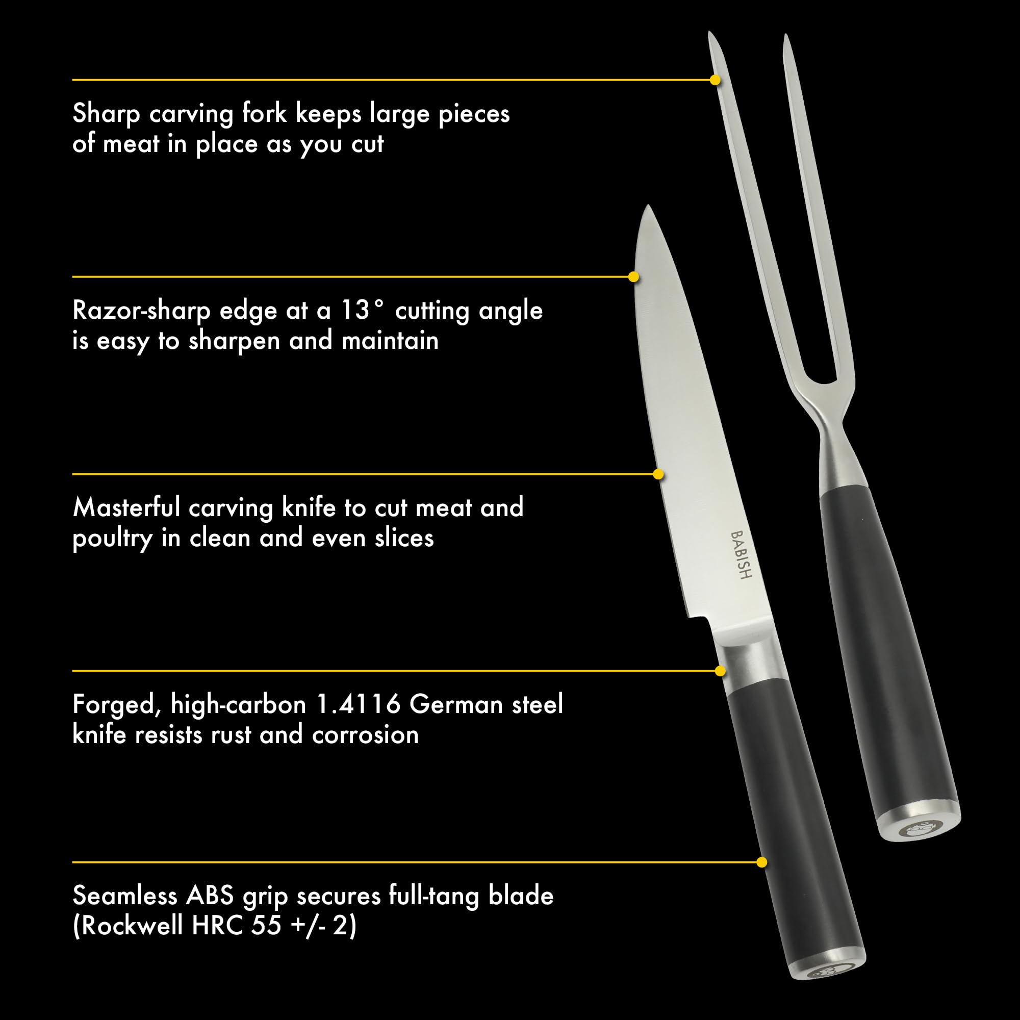 The set includes one 6.5-inch carving fork and one 8-inch carving knife.