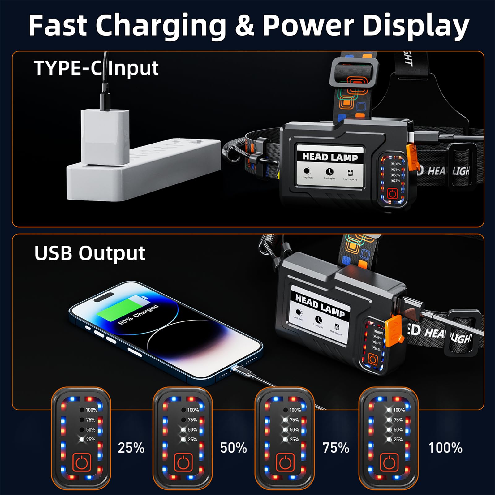 【Type-C Charging & USB Output 】Headlamps is equipped with a Type-C charging cable, which is very convenient to charge the headlamp powered through a power adapter; the hardhat headlamp can be fully charged in just 4-6 hours. It is also equipped with a USB output function, and the high-power headlight can also be used as a power bank to charge your smart devices. In addition, head lights for forehead also feature overcharge protection.