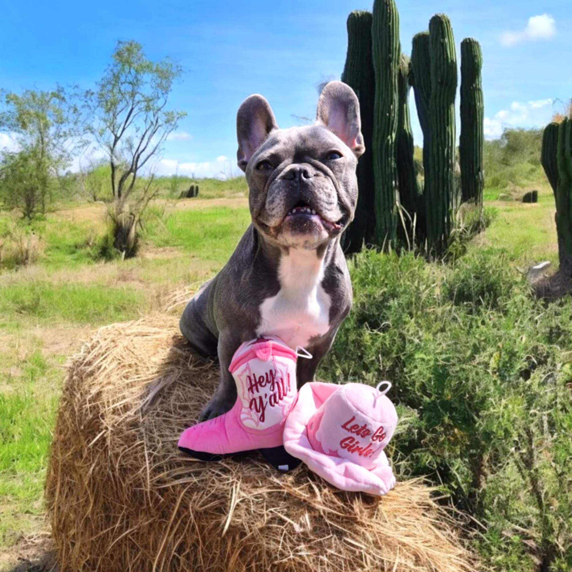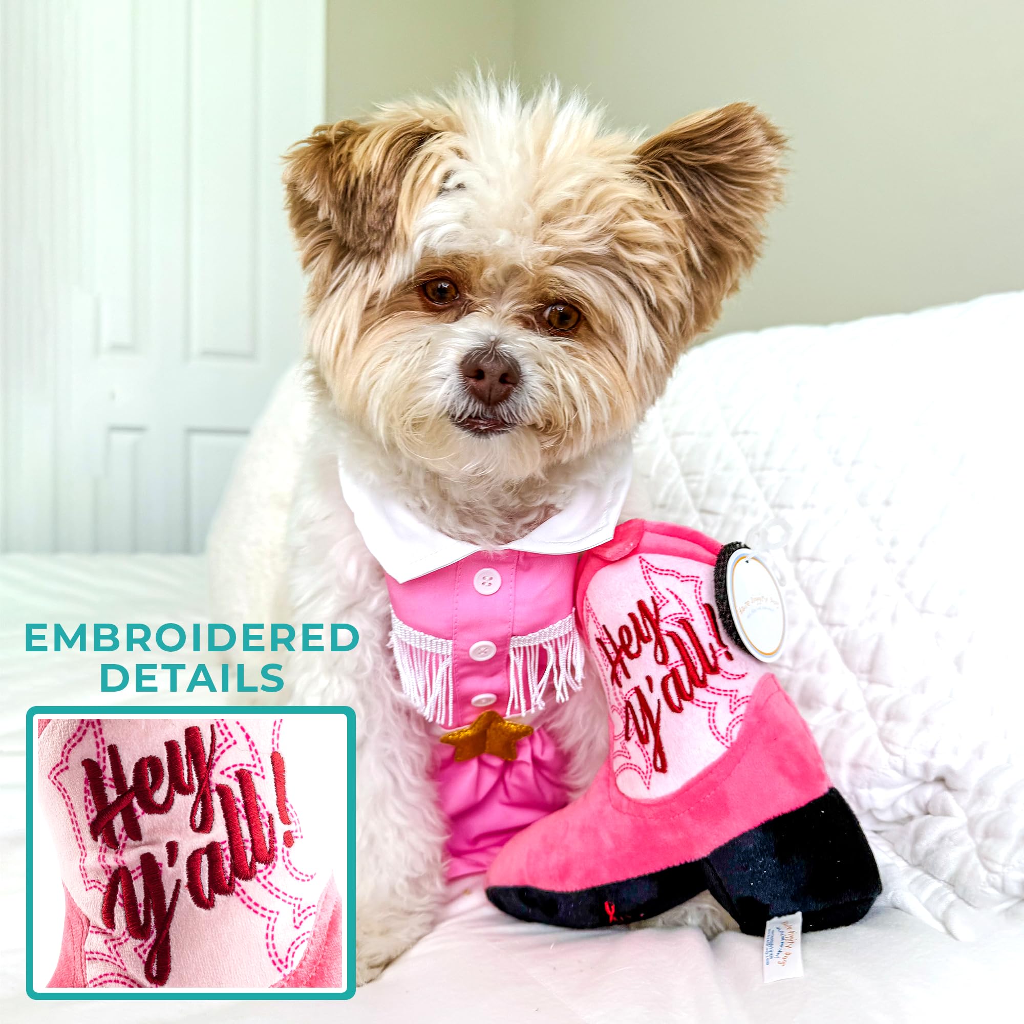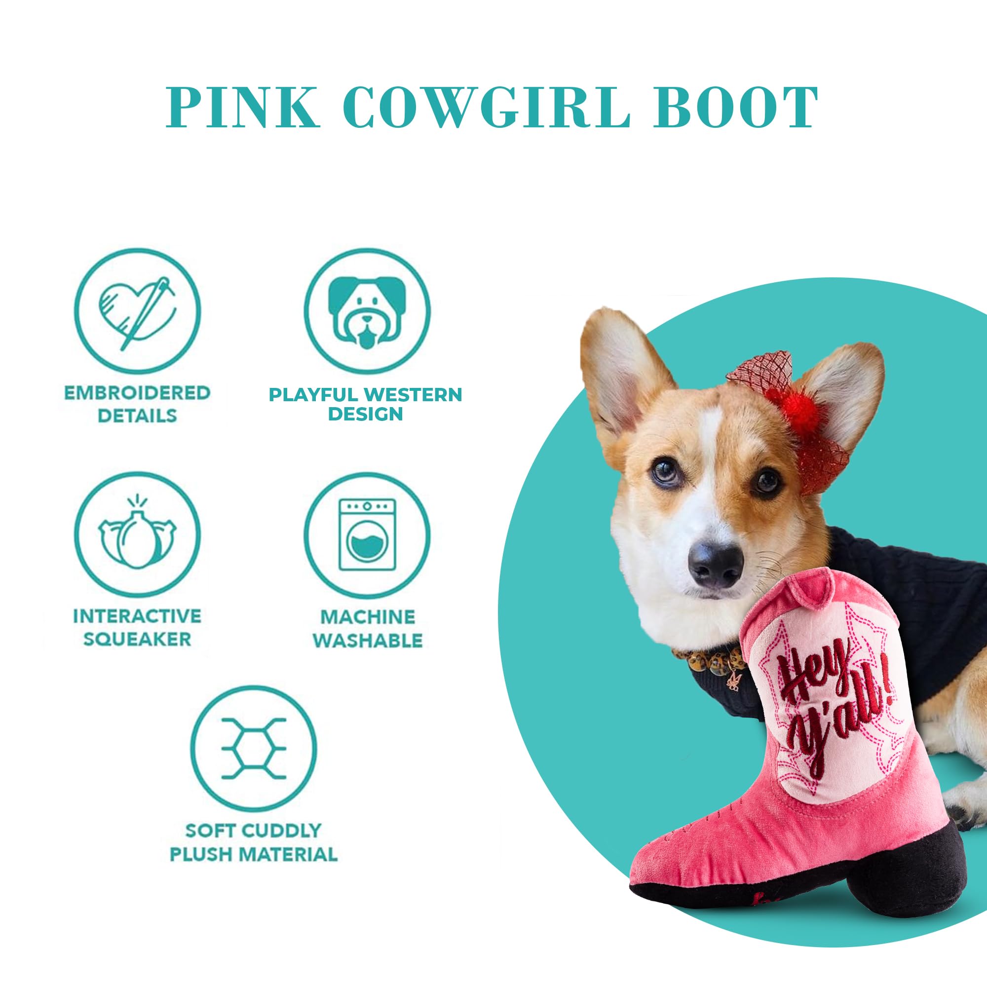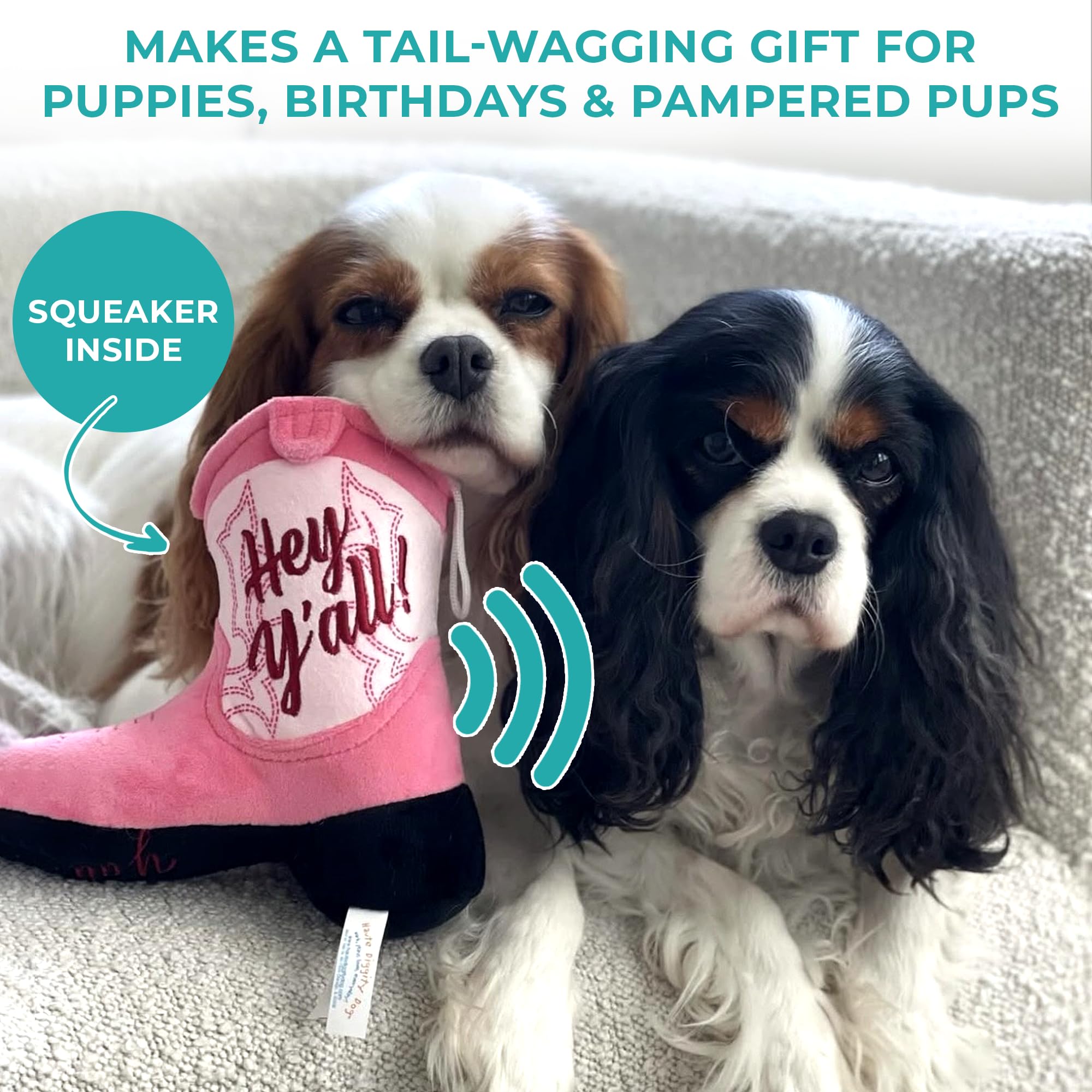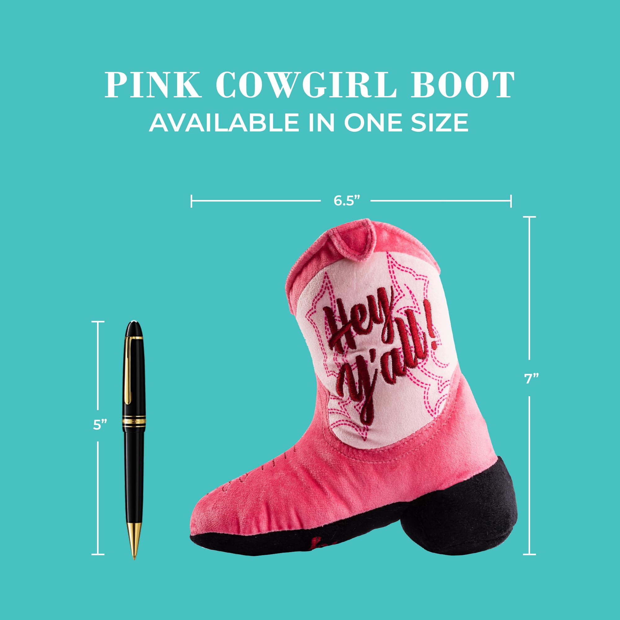 Funny Plush Dog Toy: Kick up some fun with this pink plush cowgirl boot! Embroidered with “Hey Y’all”, this stylish soft dog toy features soft plush, detailed stitching and a hidden squeaker for fashionable pups who love a little sass. Size: 7" x 6.5" x 2.5".
