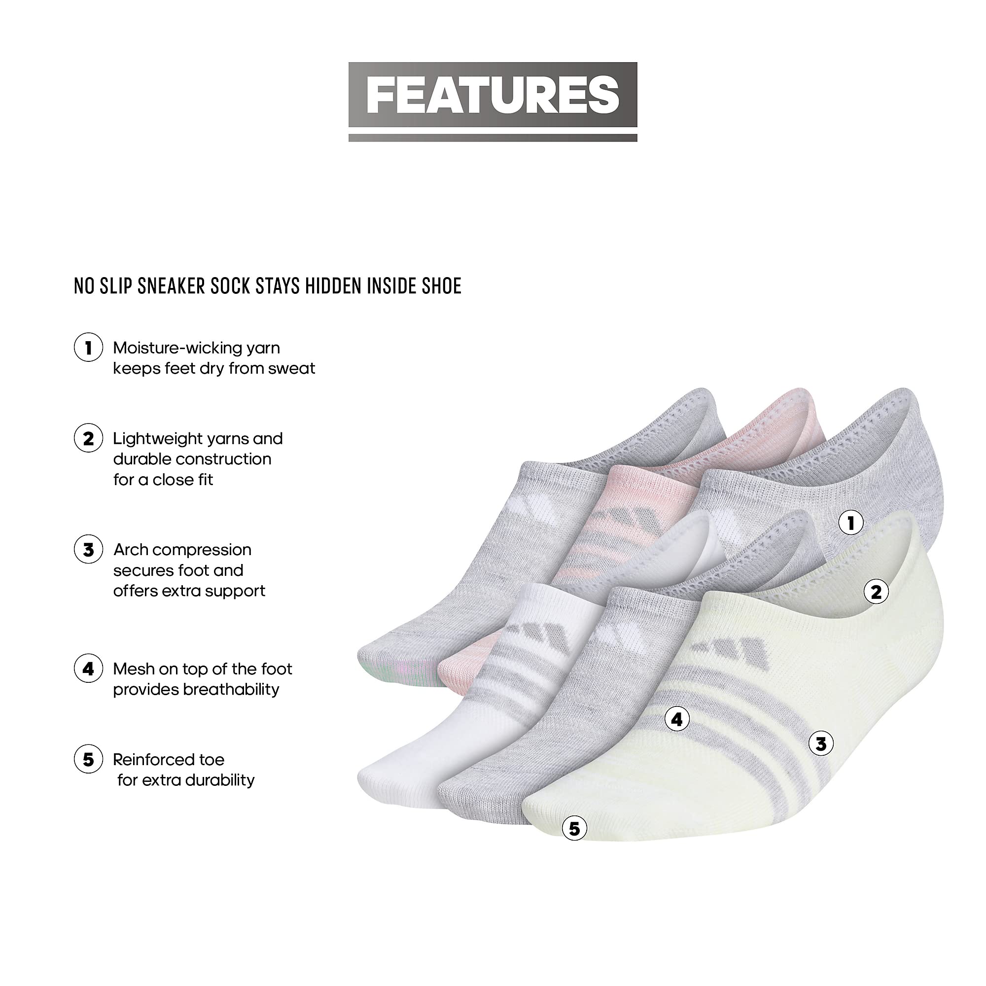 Description Push through your limits in comfort. These sneaker socks are built with extra ventilation to keep your feet dry and feeling fresh, even during demanding workouts. A reinforced toe and arch compression add durability and support to each step.
