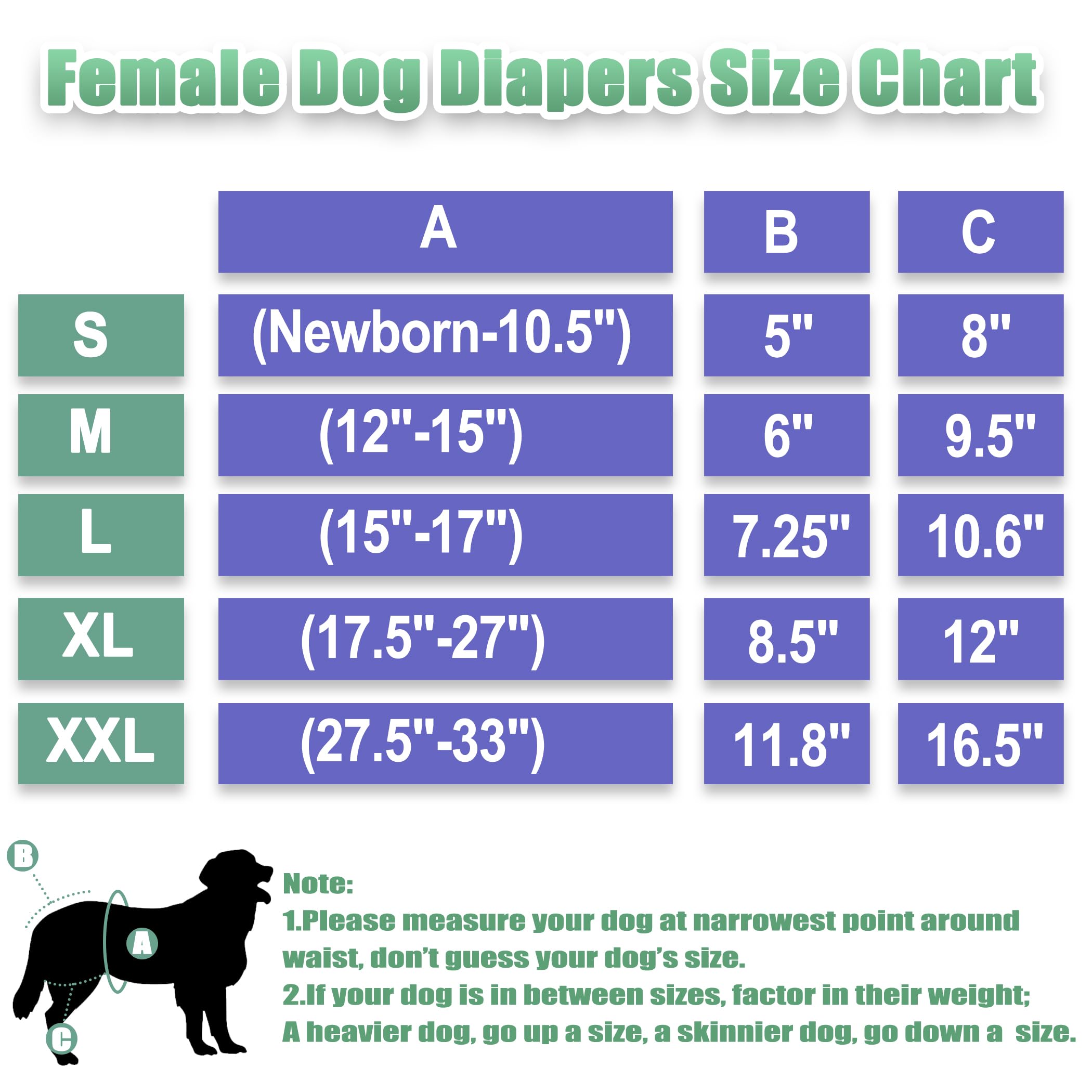 Reusable Dog Diapers-Please measure your dog's waist right in front of the back legs to make a good fit. If your dog is in between sizes, factor in their weight. A heavier dog, go up a size. A skinnier dog, go down a size.