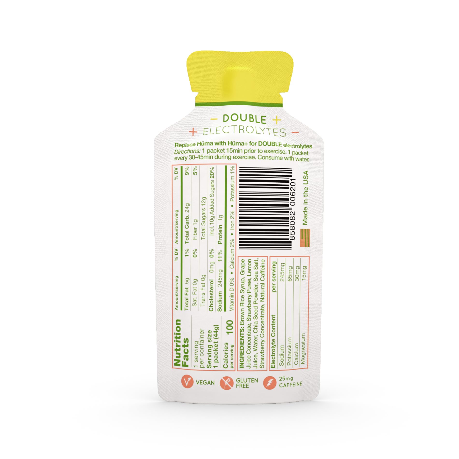 PLUS = 2x NATURAL ELECTROLYTES – Sourced from Sea Salt, Fruit and Chia Seeds. Double the electrolytes of original Huma Gel. 245mg Sodium, 65mg Potassium. Contains 100% All-Natural, Real-Food ingredients: Fruit Purees, Powdered Chia Seeds, Brown Rice Syrup.