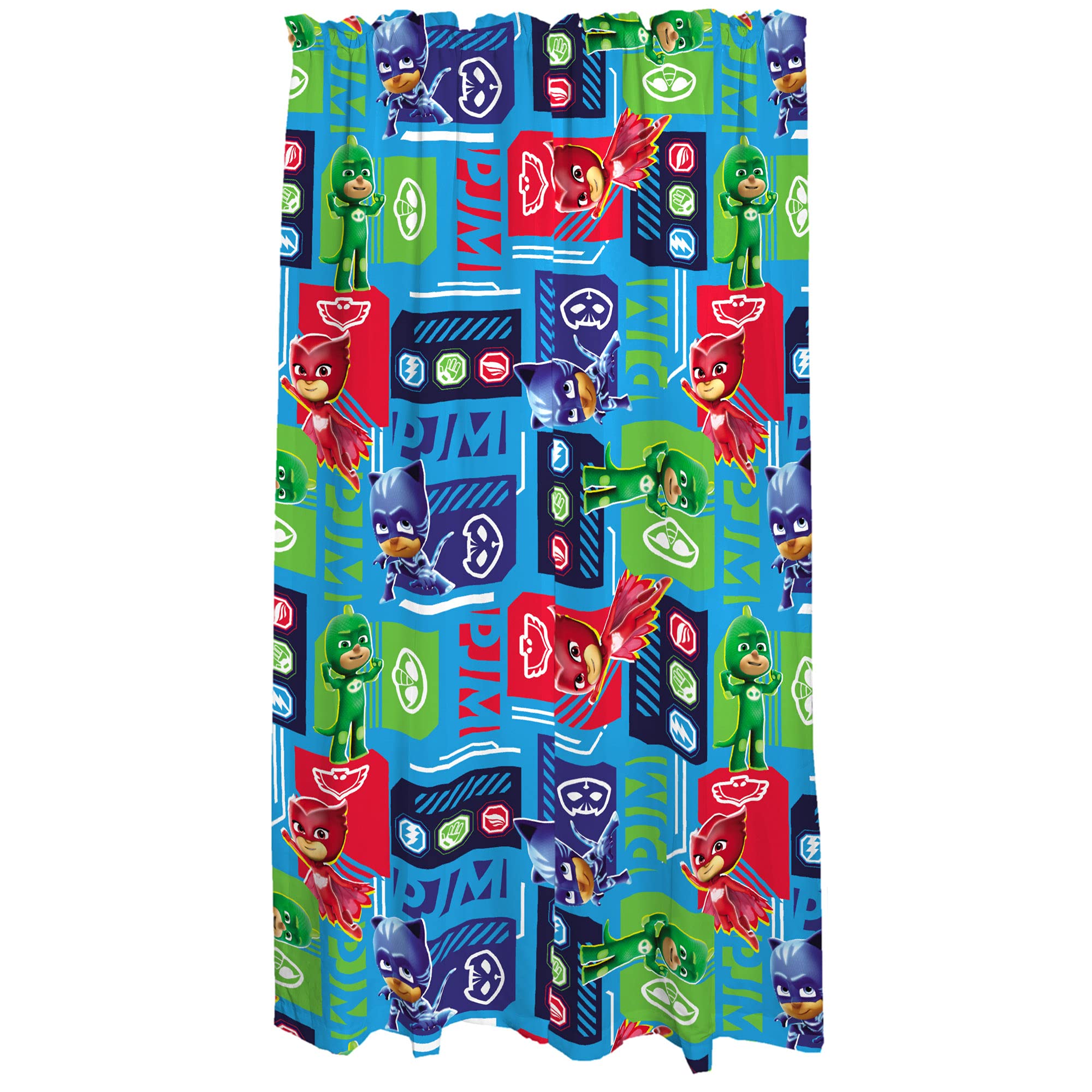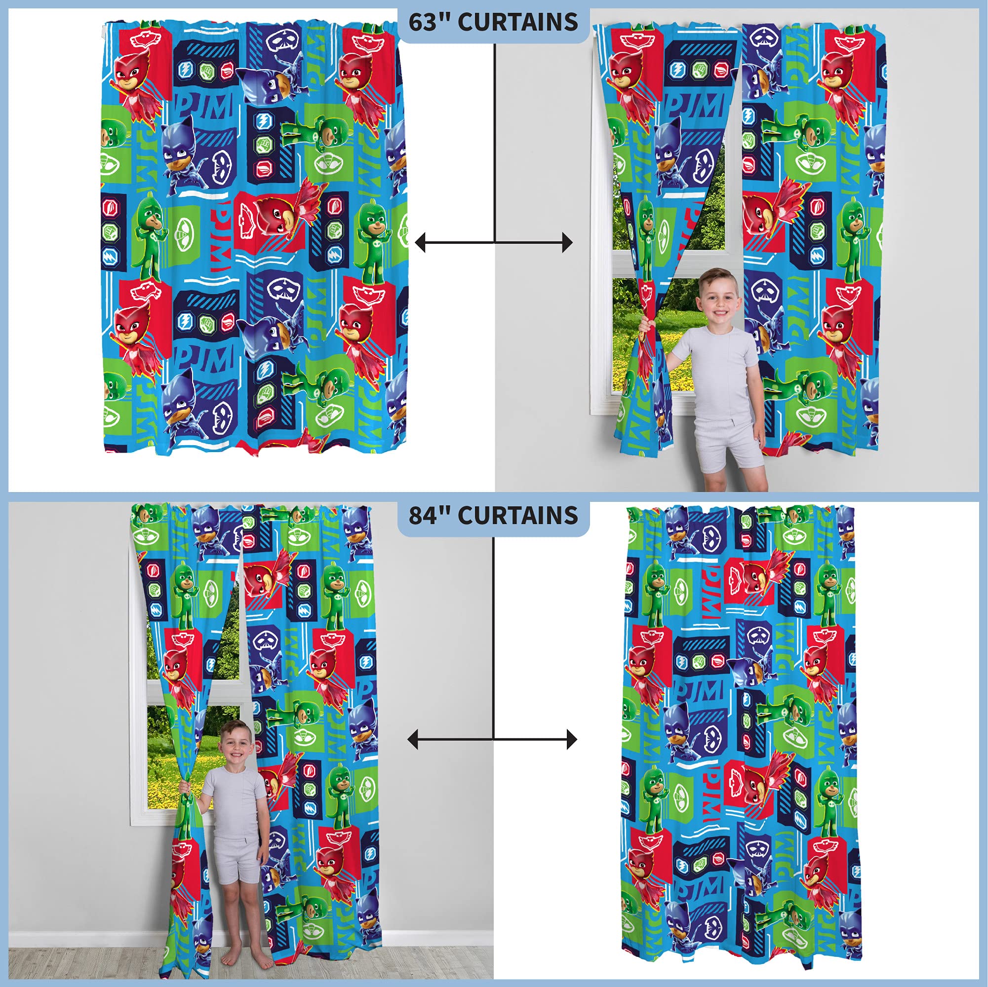 PJ MASKS DESIGN: Fans of the animated PJ Masks series from Entertainment One will love the action-packed look of these colorful drapes. Starring the show’s super heroes Catboy, Owlette, and Gekko these drapes pop with an adventurous "We Ride Tonight" pattern.
