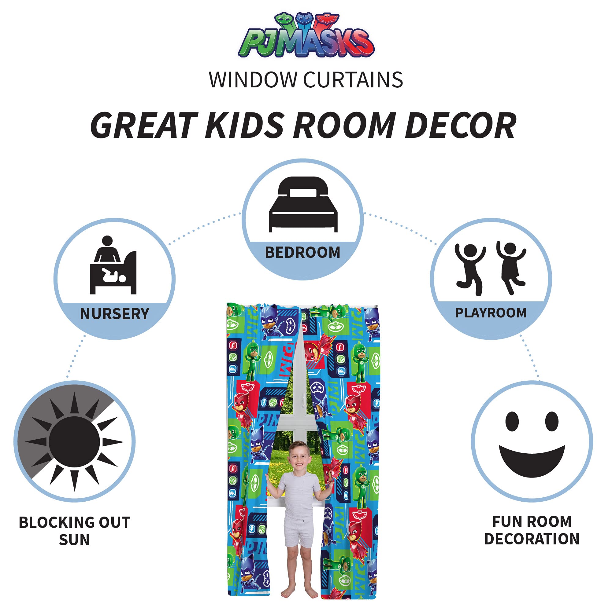 FUN ROOM DECORATION: A cool and colorful choice to brighten up a child’s bedroom, nursery or playroom, these kids’ curtains feature vibrant PJ Masks character imagery your little superheroes will love. With their bold primary colors, these fun and functional drapes add privacy and a playful look to the room of any PJ Masks fan.