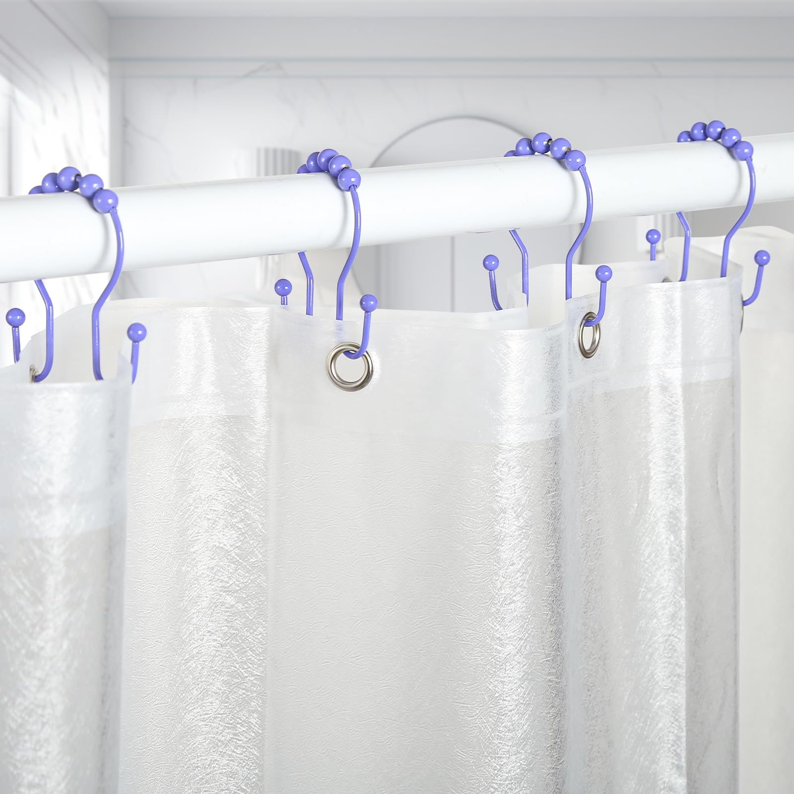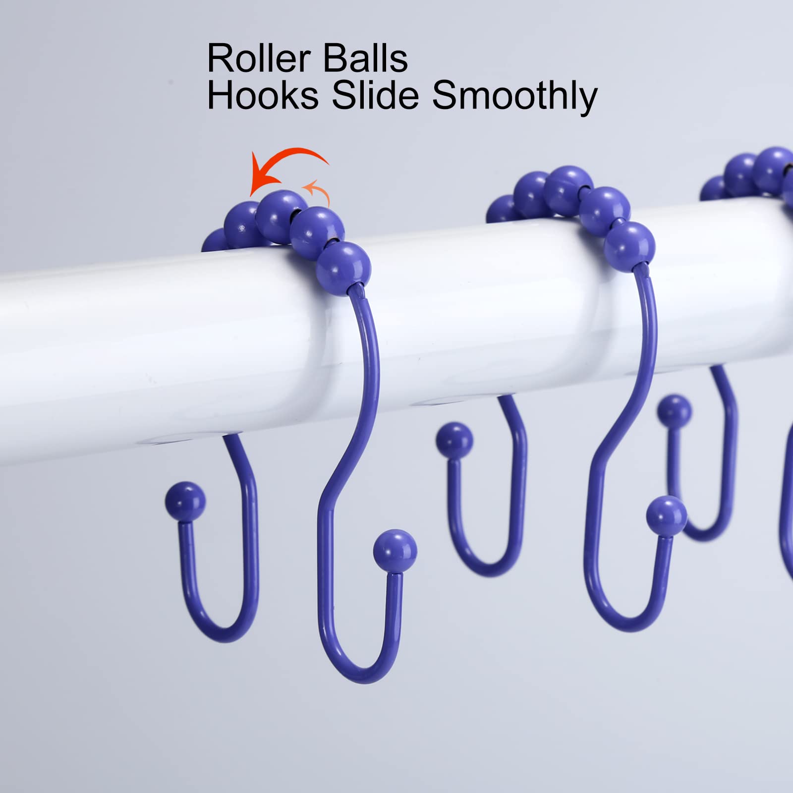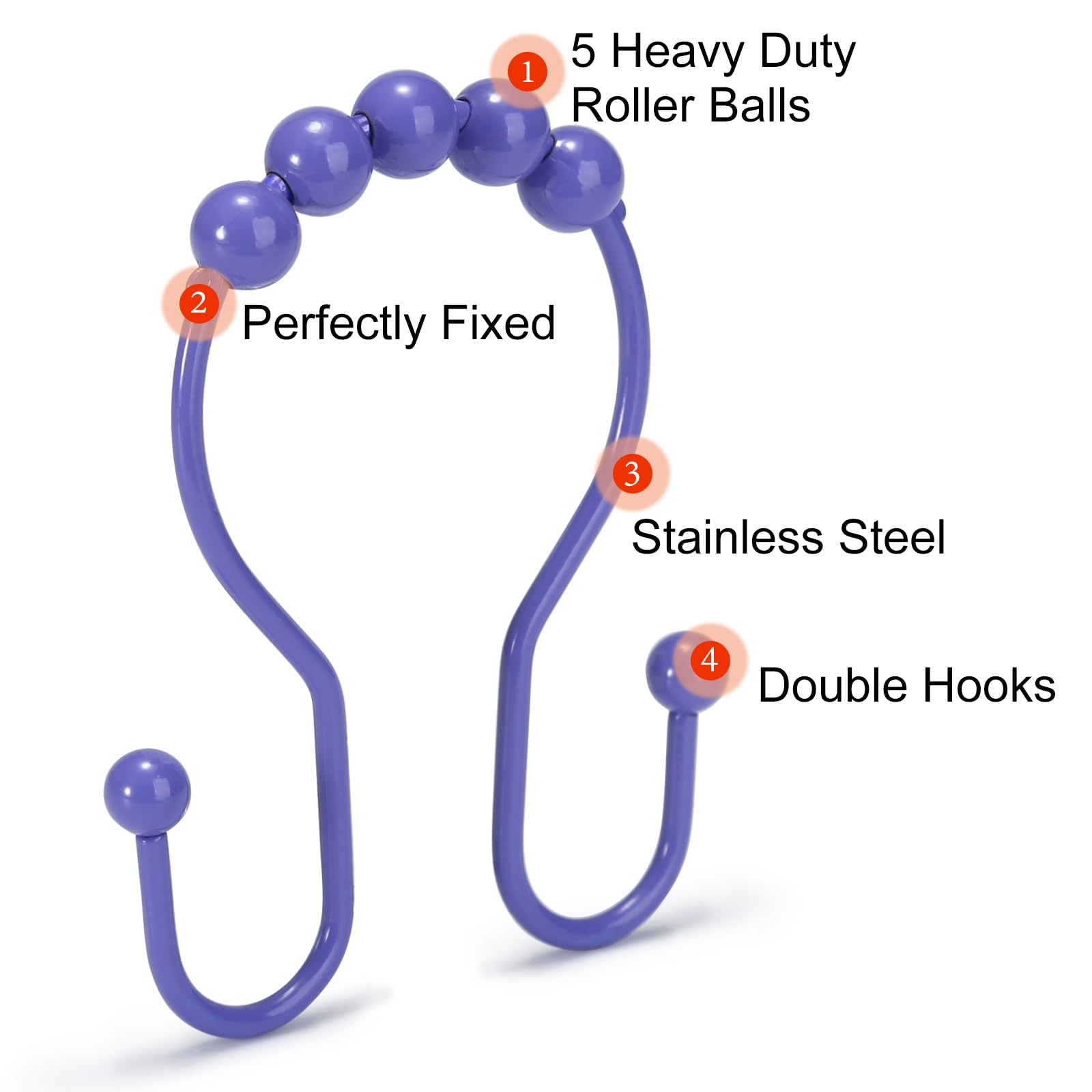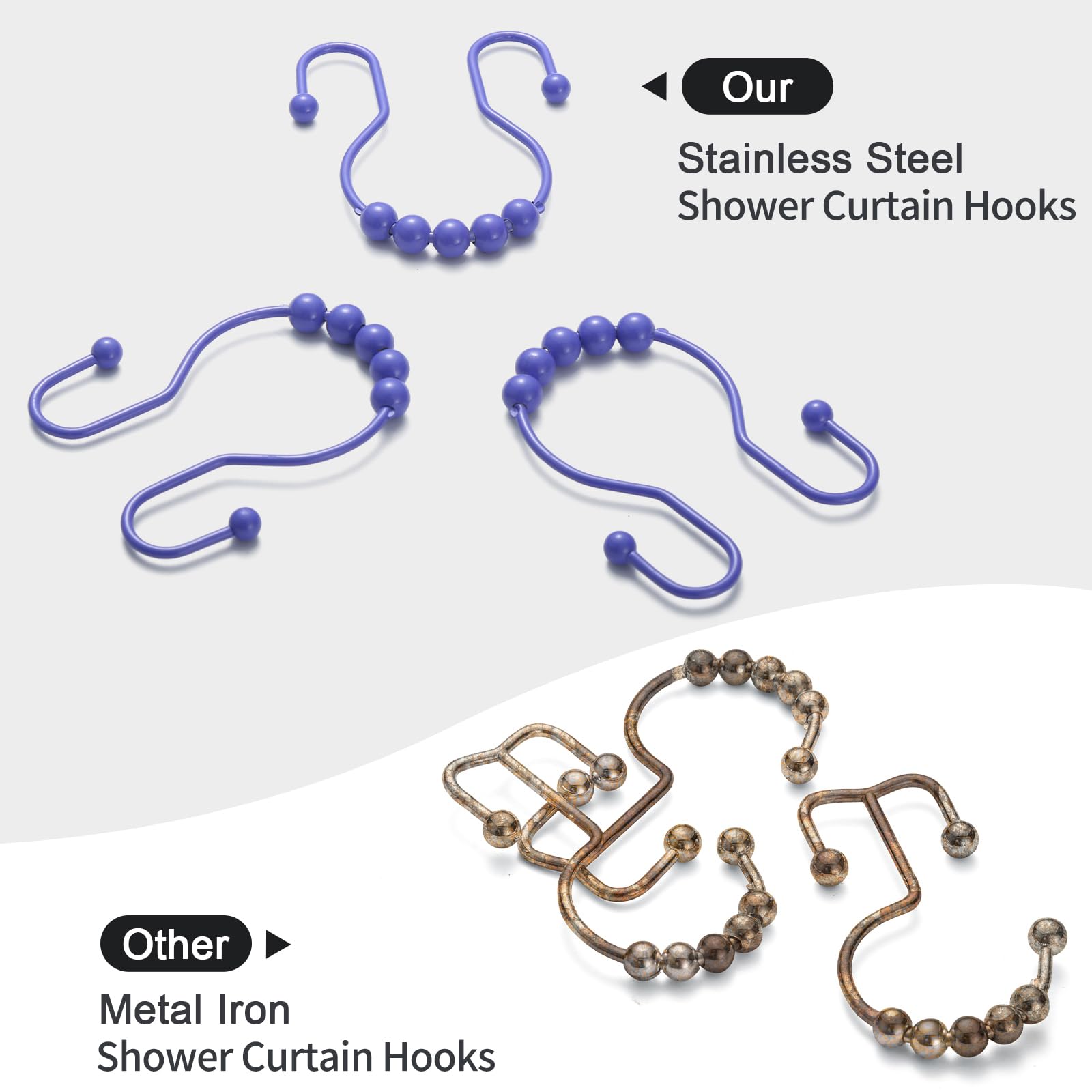 [DOUBLE SHOWER CURTAIN HOOKS]: The shower curtain rings rust proof are made of exquisite craft. The obstacle on both sides fix the roller balls to keep balance, which prevents the shower curtain from falling off, it's strong enough to hold both the heavy curtain and liner.