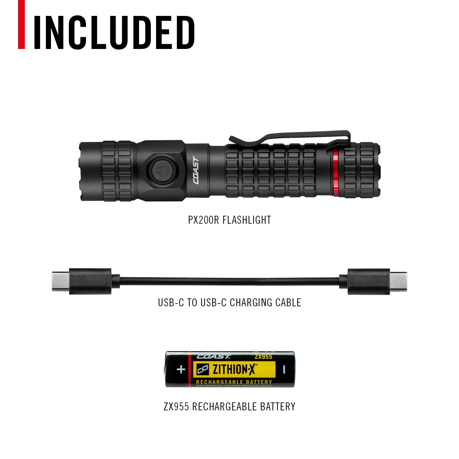 The PX200R flashlight delivers the power and performance you need to tackle demanding jobs with confidence. Producing up to 2,000 lumens and featuring five versatile light modes, it’s built to adapt to any situation—whether on the worksite, in an emergency, or for everyday carry. A 5000mAh rechargeable battery powers nearly an entire workday in High mode and lasts up to 150 hours in MoonGlow™ mode, ensuring you’re never left in the dark. The durable aluminum construction, IP54-rated water and dust resistance, and anti-roll design make the PX200R a reliable companion in tough environments. Twist Focus technology provides effortless transitions between PURE BEAM® Flood and BULLS-EYE™ Spot beams, while the charge-level indicator and USB-C charging offer modern convenience. Compact and portable, the PX200R is the ultimate tool for anyone who needs a dependable lighting solution.