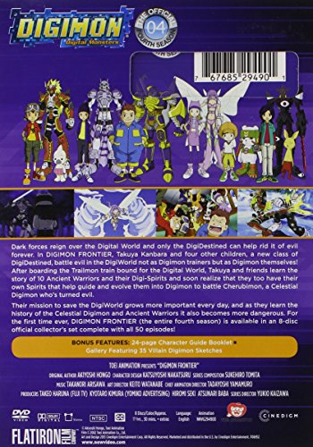 Product Description Dark forces reign over the Digital World and only the DigiDestined can help rid it of evil forever. In DIGIMON FRONTIER, Takuya Kanbara and four other children, a new class of DigiDestined, battle evil in the DigiWorld not as Digimon trainers but as Digimon themselves! After boarding the Trailmon train bound for the Digital World, Takuya and friends learn the story of 10 Ancient Warriors and their Digi-Spirits and soon realize that they too have their own Spirits that help guide and evolve them into Digimon to battle Cherubimon, a Celestial Digimon who's turned evil. Their mission to save the DigiWorld grows more important every day, and as they learn the history of the Celestial Digimon and Ancient Warriors it also becomes more dangerous. For the first time ever, DIGIMON FRONTIER (the entire fourth season) is available in an 8-disc official collector's set complete with all 50 episodes! Special Features: 36-page Character Guide Booklet; Villain Photo Gallery