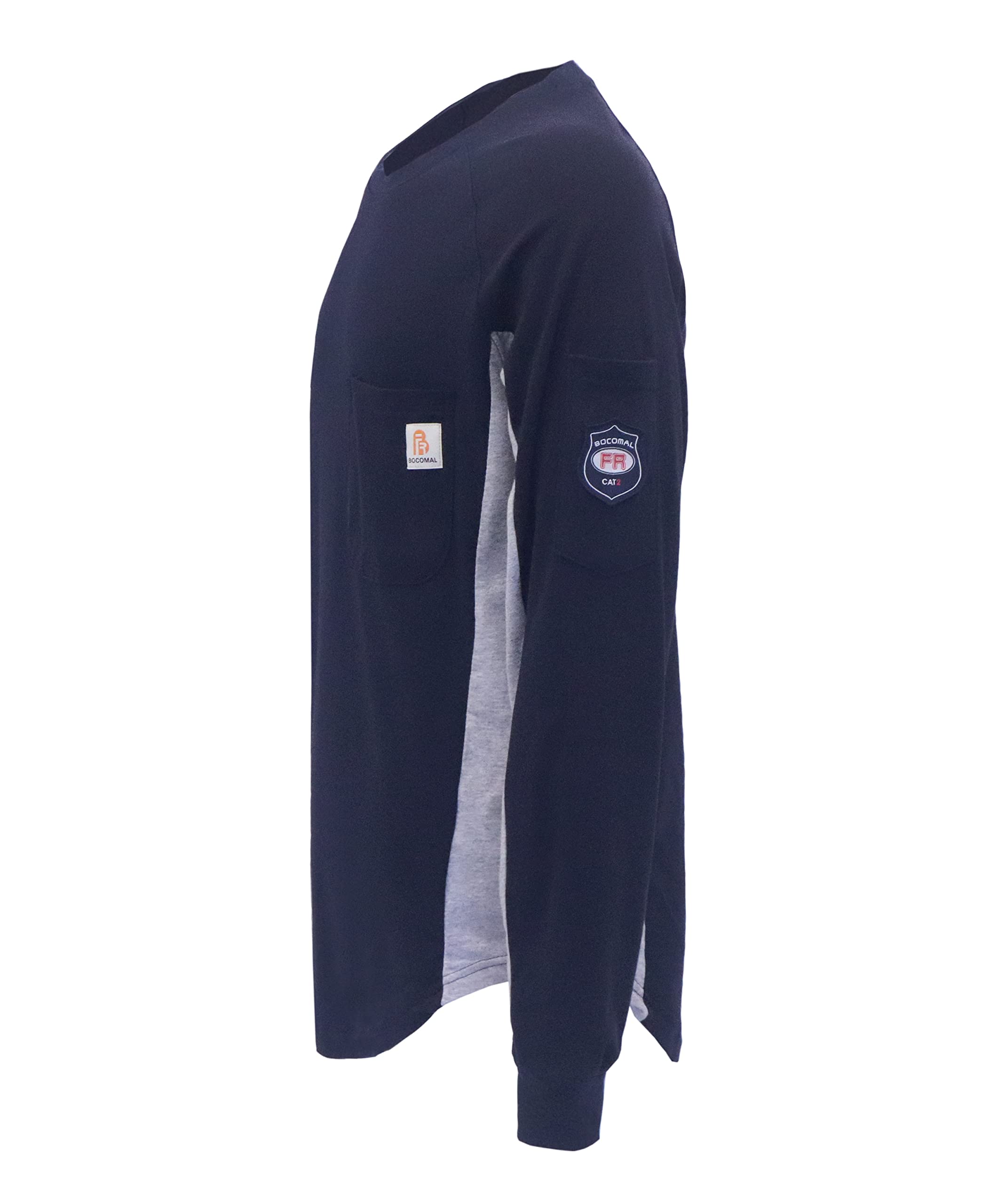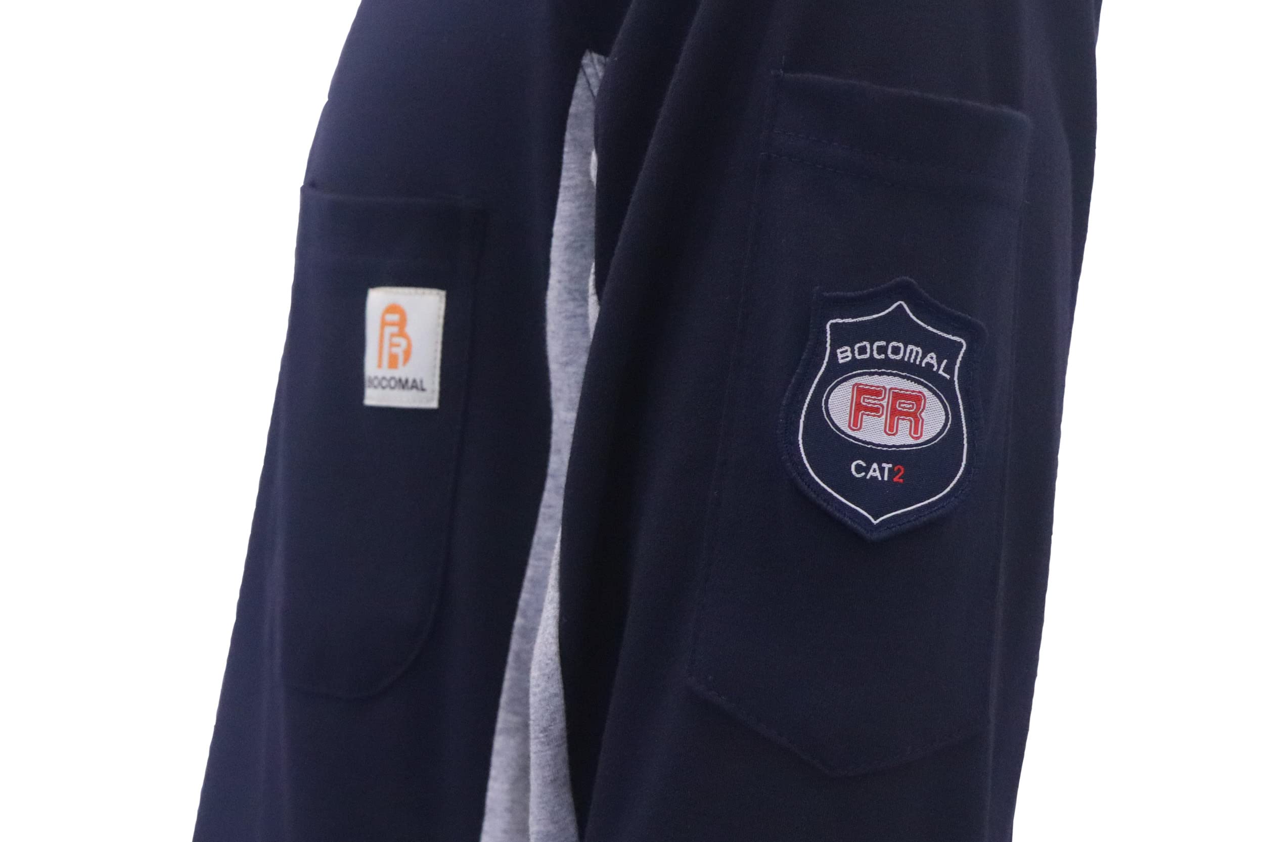 FR MATRIALS:5.5OZ Cotton Knit FR Treated,FR Buttons,FR Sewing Threads!Clear FR Tag on arms and bottom front.More FR info On Neck Tag About UL Certification.We Attached A Small Sample Inside Package For Cunstomers Simple FR Try