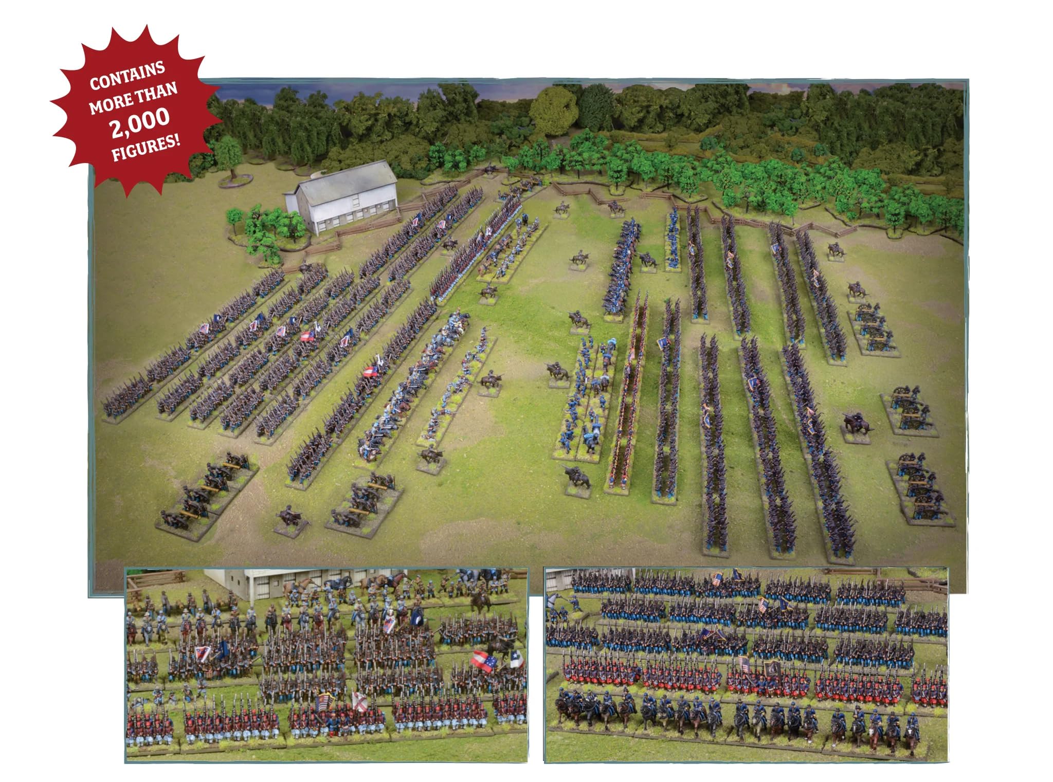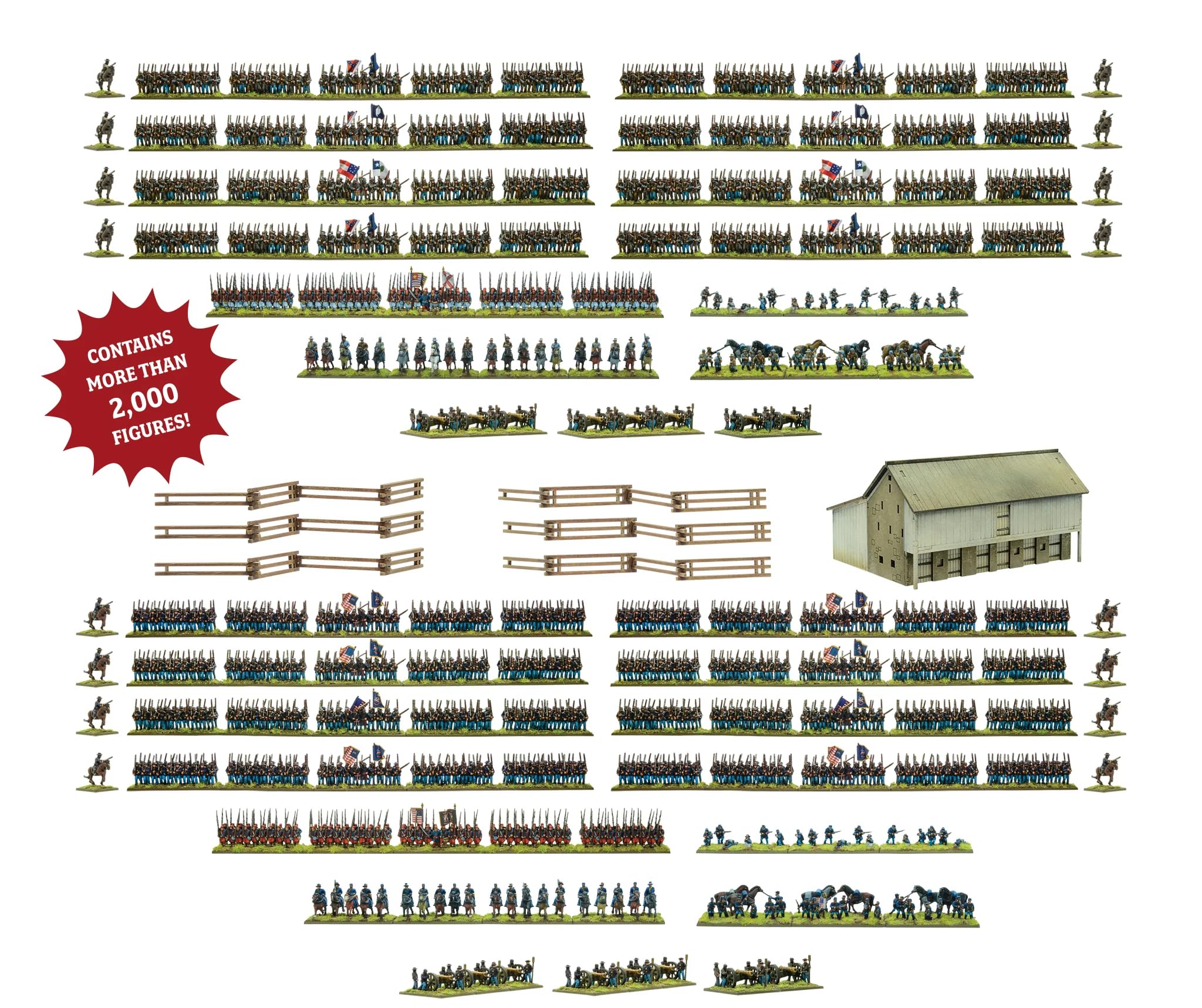 Fought over the first three days of July in 1863, the battle for Gettysburg proved to be the high tide of the Confederacy and the turning point of the American Civil War. The Confederate army of North Virginia, under General Lee, and fresh from victory over the Union at Chancellorsville, assaulted the Army of the Potomac under Union General Meade at the crossroads town of Gettysburg in the deadliest battle of the entire conflict. The battle ended following the near suicidal attack known as Pickett's Charge which led to the battered rebel army withdrawing from the field. Lee's invasion of the North had been halted. This box set contains over 2,000 men. Each of the two armies are presented on color-coded plastic sprues; the push-fit pieces are extremely easy to assemble - enabling you to quickly get to the business of gaming this fascinating era of history on the epic scale it deserves. You’ll also find some MDF scenery to lend your battles extra authenticity. Epic Battles: American Civil War - Gettysburg Contains: Union army (blue plastic) - 8 infantry regiments, 1 Zouave regiment, 1 cavalry regiment, 1 dismounted cavalry regiment, 1 skirmishers regiment, 8 cannon & 8 mounted commanders. Confederate army (grey plastic) - 8 infantry regiments, 1 Zouave regiment, 1 cavalry regiment, 1 dismounted cavalry regiment, 1 skirmishers regiment, 8 cannon & 8 mounted commanders. Green plastic bases for all figures. A5 Black Powder rulebook. 36-page American Civil War background, scenario and supplemental rule booklet. Flag sheets for both Union and Confederate forces. Laser-cut MDF farm building. Laser-cut MDF Snake fences. Six D6 dice. Models supplied unassembled and unpainted.