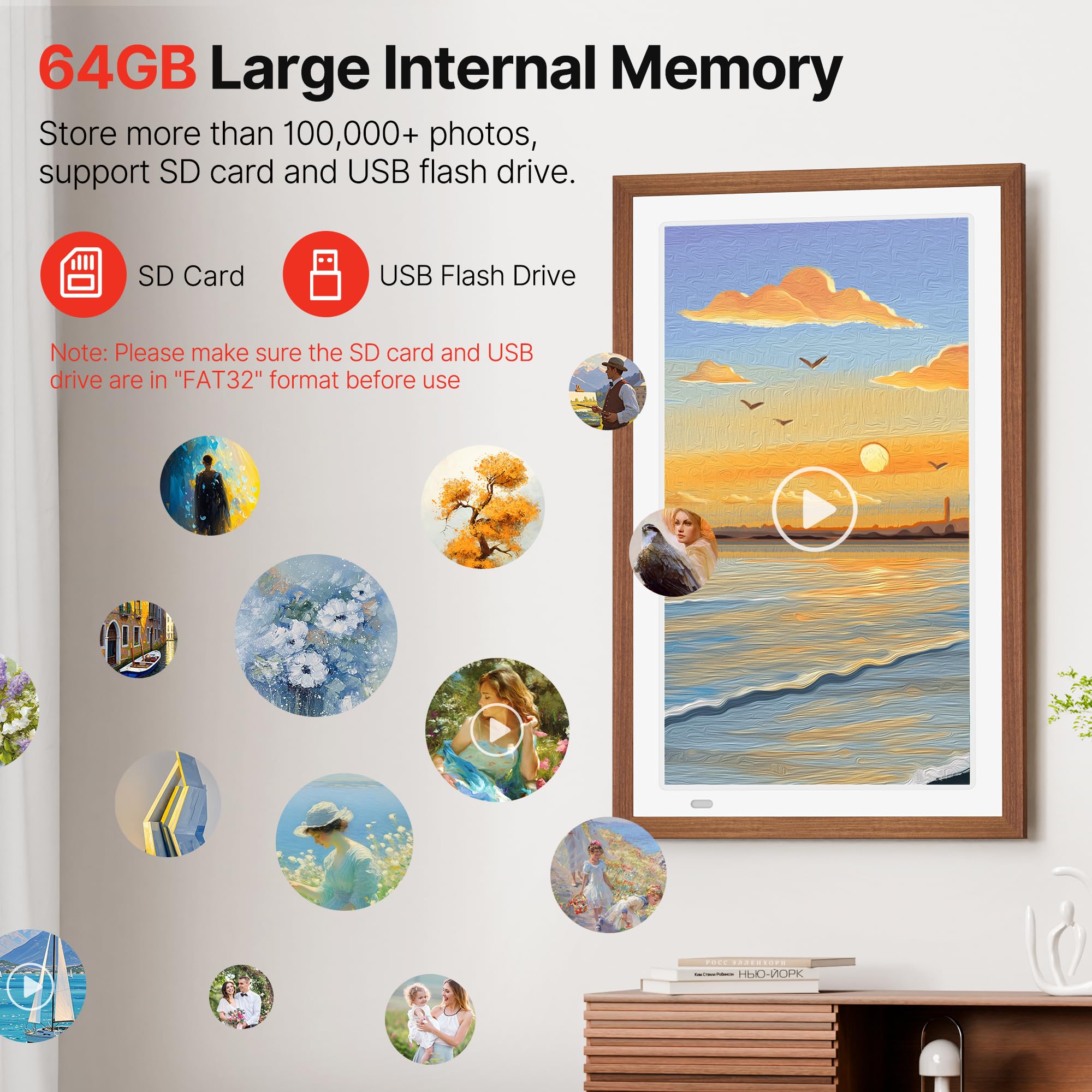 【64GB Large Memory, and Supports SD Card/USB Drive】This 21.5-inch WiFi digital picture frame has built-in 64GB large storage, allowing holding up to 100,000 photos. And support for SD Card (Max: 128GB) and USB drive (Max: 128GB), providing additional storage options. With compatibility for Uhale PC web, SD cards, and USB disks, importing or backing up your photos and videos is quick and easy. Create a personalized artistic photo album and cherish your unforgettable moments