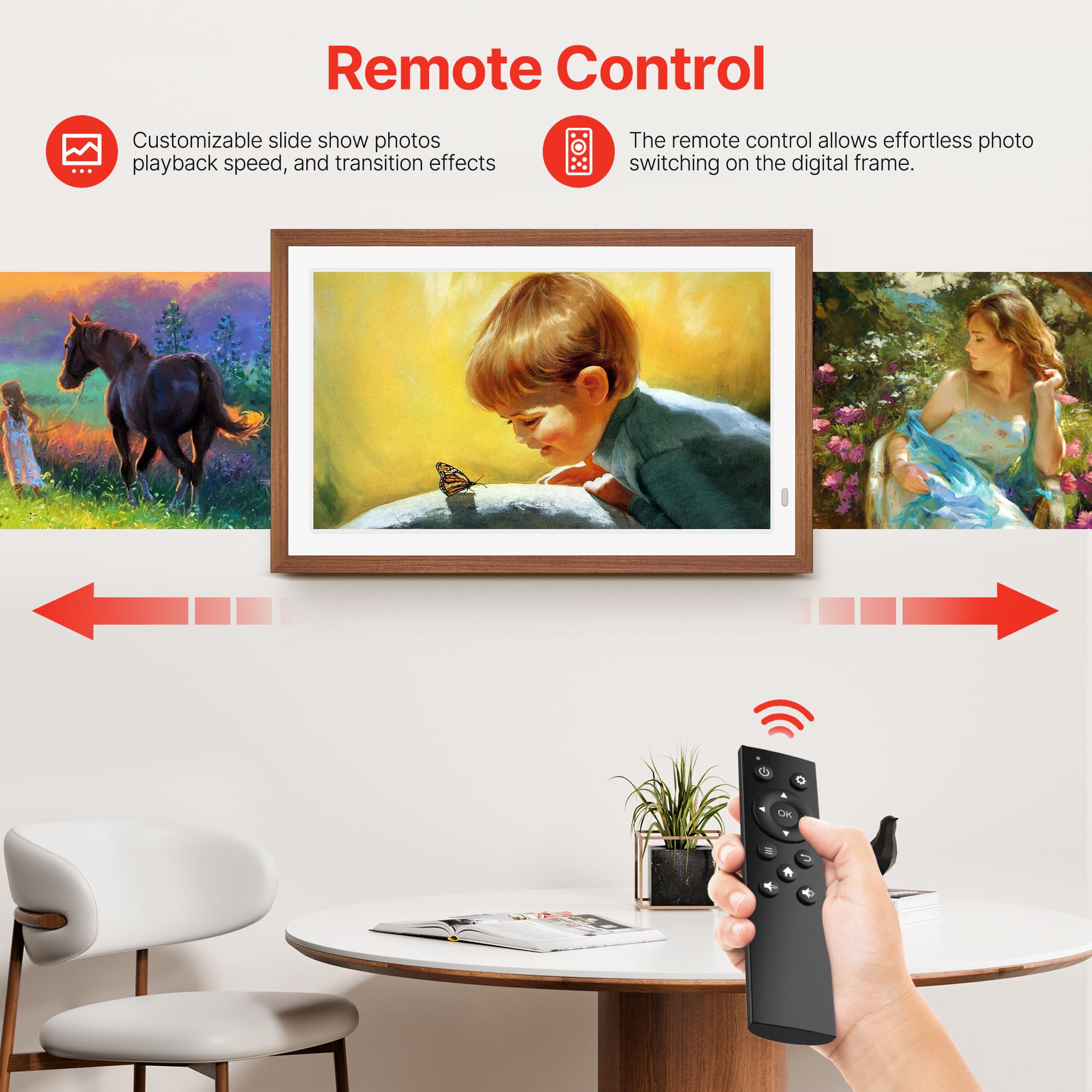 【Powerful Functions with Easy Management】①Use the remote to easily navigate the user-friendly interface to display your favorite photos/videos. ②Auto-rotate function, equipped with desktop and wall mount brackets, switches between horizontal and vertical. ③Send instant or scheduled blessings to the digital frame, with built-in blessing templates. ④Customize settings like photo titles, weather, clock display, slideshow mode, playback order, brightness, video volume, and sleep mode