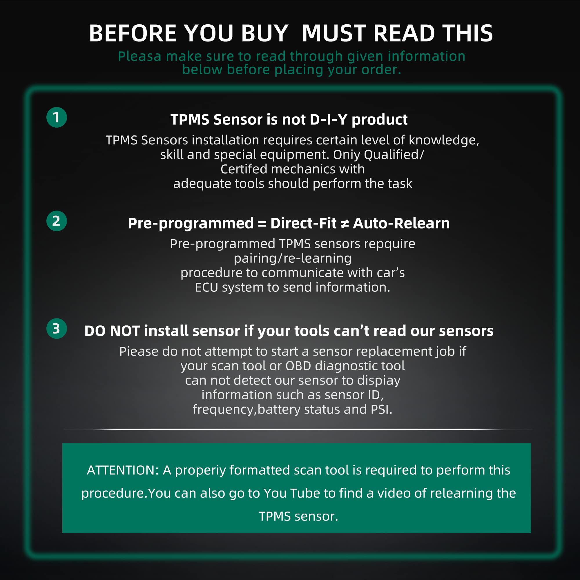 NO SENSOR PROGRAMMING REQUIRED :The tire pressure monitor system (TPMS) come pre-programmed specifically for your make/model/year of vehicle,just need activate them with scan tool